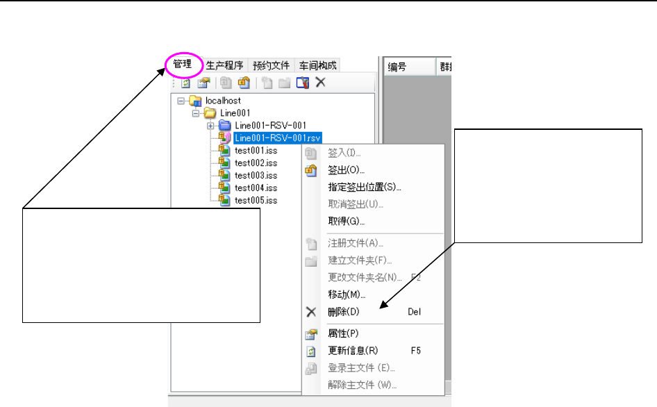 JaNets 使用说明书 8 作业优化 8- 23 8-3- 13 数据库内预约文件 的删除 执行以下① 或②的操作。 图 8-3- 38 主 画面‐「程序 资源管理器(管理) 」-「 删 除」 ②选择「删除」 ※显示出「确认删除」提示信 息,点击 「 是 」 ,删除选择的 文件并关闭提示信息。 ① 在程序资源管理器的管理画面内选 择预约文件 ( 可多选 ) ,点击程序资 源管理器工具条中的「删除」 ( × ) 。