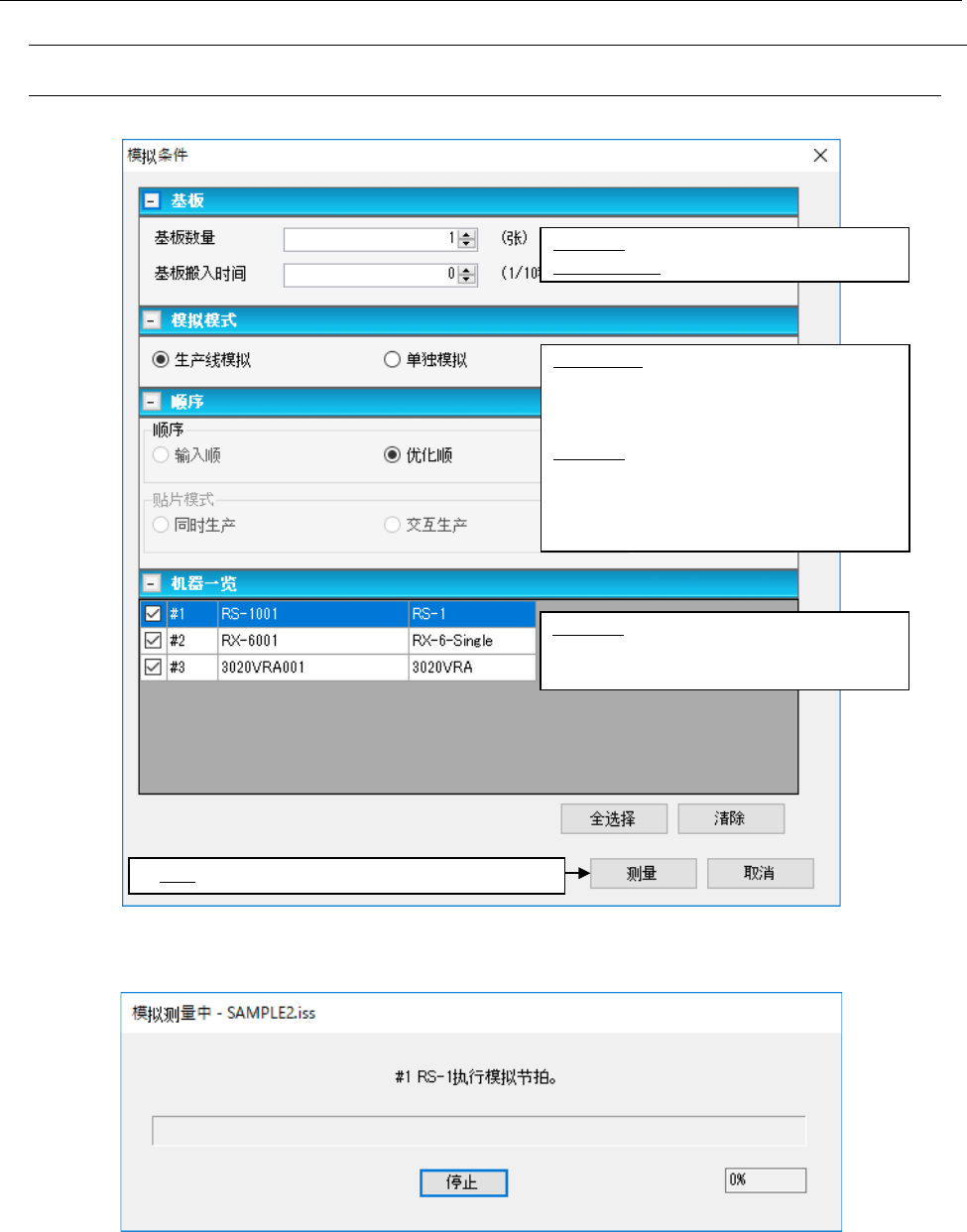 JaN et s 使用说 明书 9 节拍模 拟 9-4 9- 3 操作步骤 9-3- 1 模拟条件设置画面 9-3-1- 1 有生产程序时 模拟条件画面显示如 下。 图 9-3-1 模拟条件设置画面 图 9-3-2 模拟测量中画面 测量结束时,会显示 记录结果 画面。 基板数量 :输入 要模拟的 基板 的数量。 基板搬入 时间 :输入基 板搬 入间隔。 生产线 模拟 :测量全 部生 产线。 「顺序 」固 定为优化 顺序 ,输入顺 序无 …