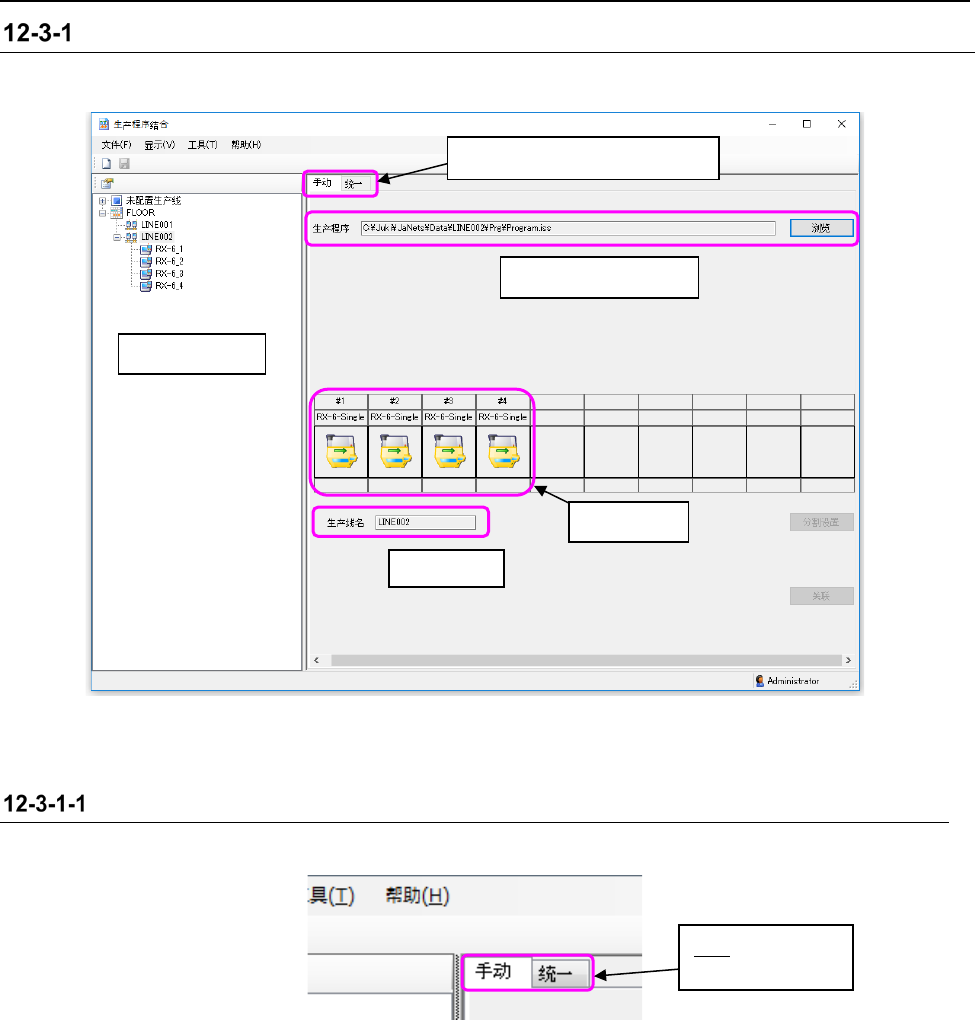 JaNets 使用说明书 12 生产程序结合 12 -3 12 -2 菜单构成 菜单项目 表 12 -2-1 菜单项目的说明 菜单项目 内容 文件 (F) 新建 (N) 清除编辑中的内容 保存 (S) 生产程序覆盖保存(仅手动关联时) 另存为 (A)… 显示关于生产程序的「另存为」对话框 (仅手动关联时) 结束生产程序结合 (X) 退出生产程序结合 显示 (V) 工具条 (T) 显示 / 隐藏工具条 状态栏 (B) 显示 / 隐藏状态栏…