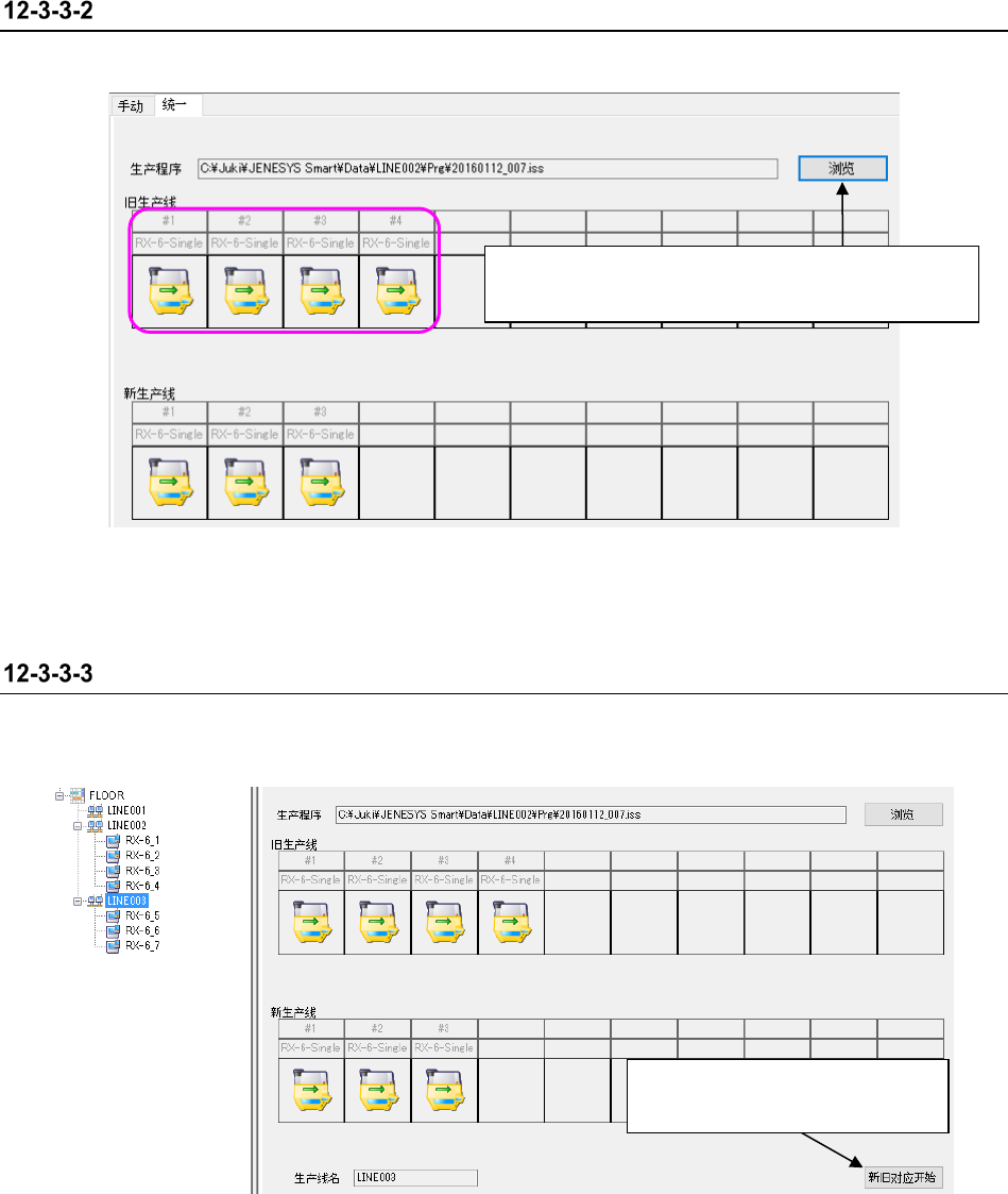 JaNets 使用说明书 12 生产程序结合 12 - 11 点击要对应的旧 生产线的机器时 ,在新生产线 端可选择的机器 以高亮度显示 。 图 12 -3- 11 对应新旧生产 线(高亮度显示状态) 点击新生产线端 的可选择机器时 ,会显示选择 的旧生产线与新 生产线之间的 连线。 图 12 -3- 12 对应新旧生产 线(结合后的状态) 通过点击其他要对应的旧生产线的机器, 可进行连续对应操作。 点击要对应的旧生产线的机器。 点击「…