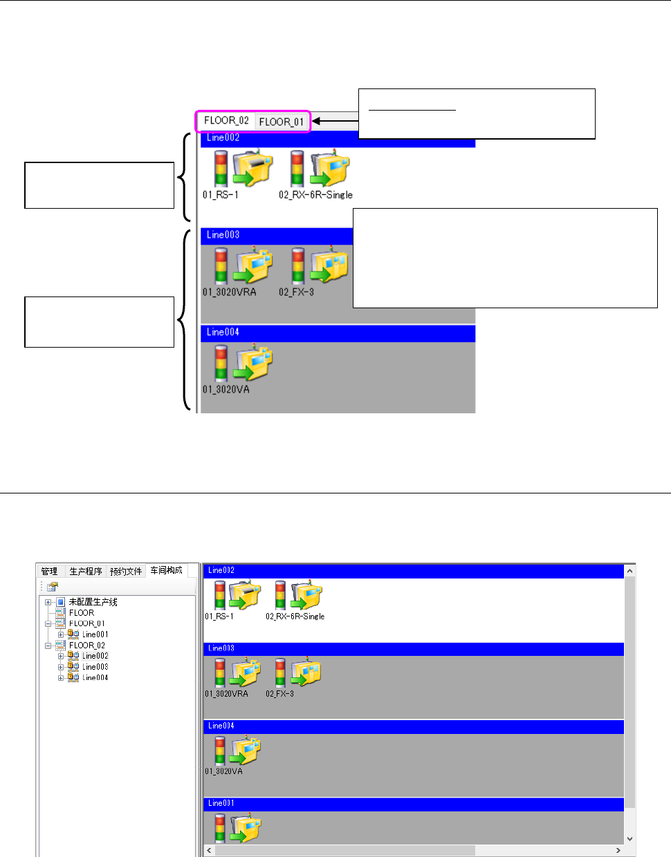显示生产线构成的一览表。也显示车间、生产线的设定信息一览表。