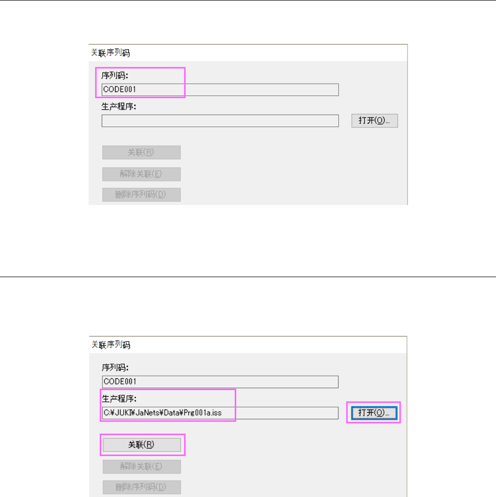 点击「打开」按钮,指定关联的生产程序。在关联画面显示生产程序的保存位置。在完成序列码读