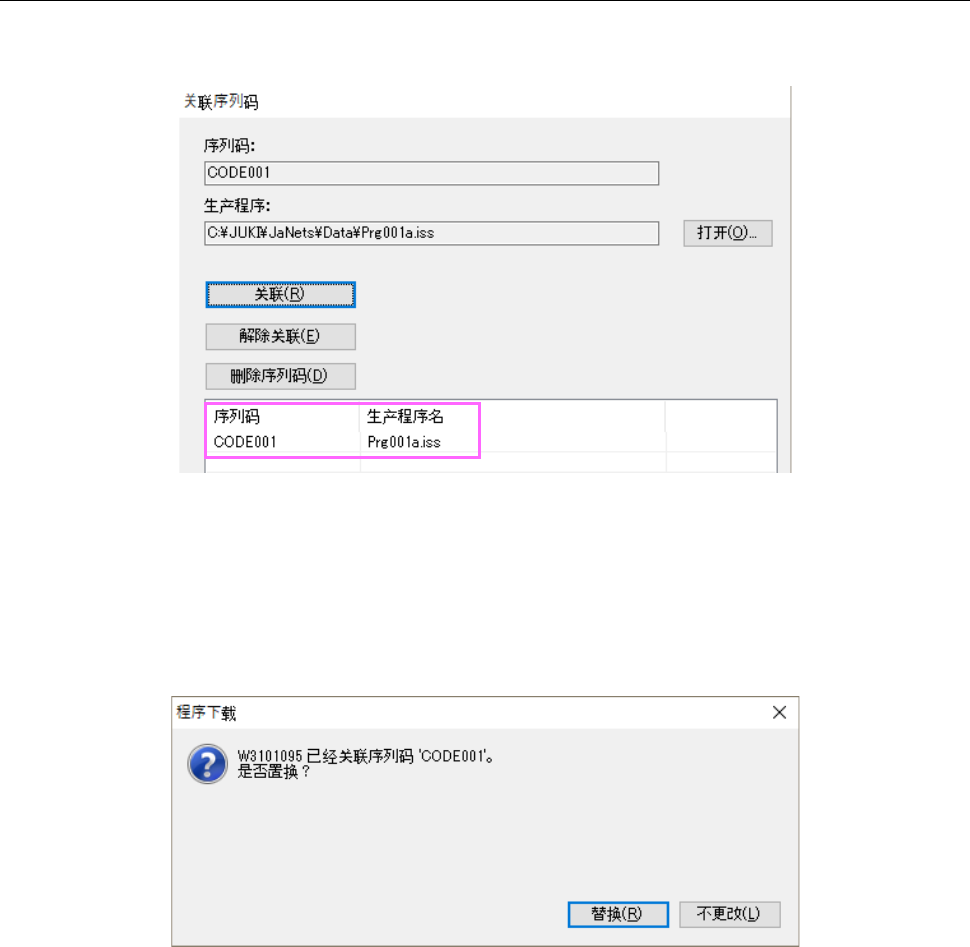 ※ 对已经关联了生产程序的序列码,要关联别的生产程序时,会显示出是否替换关联信息的确认信