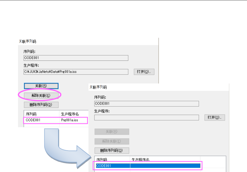 解除关联就是从序列码、生产程序的关联信息中,删除生产程序相关的信息。在列表中选择希望解