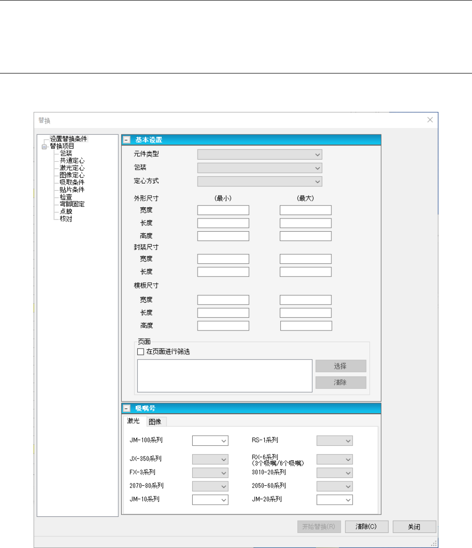 JaNets 使用说明书 16 程序管理器 16 - 33 项目 内容 元件类型 在下拉框选择替换对象的元件类型。 包装 在下拉框选择替换对象的包装。 定心方式 在下拉框选择替换对象的定心方式。 外形尺寸 宽度 输入替换对象元件尺寸宽度的最小值、最大值。 输入范围为 0. 0 01 ~ 180.0 0 0 。 长度 输入替换对象元件尺寸长度的最小值、最大值。 输入范围为 0.0 01 ~ 180.00 0 。 高度 输入替换对象元件尺寸…