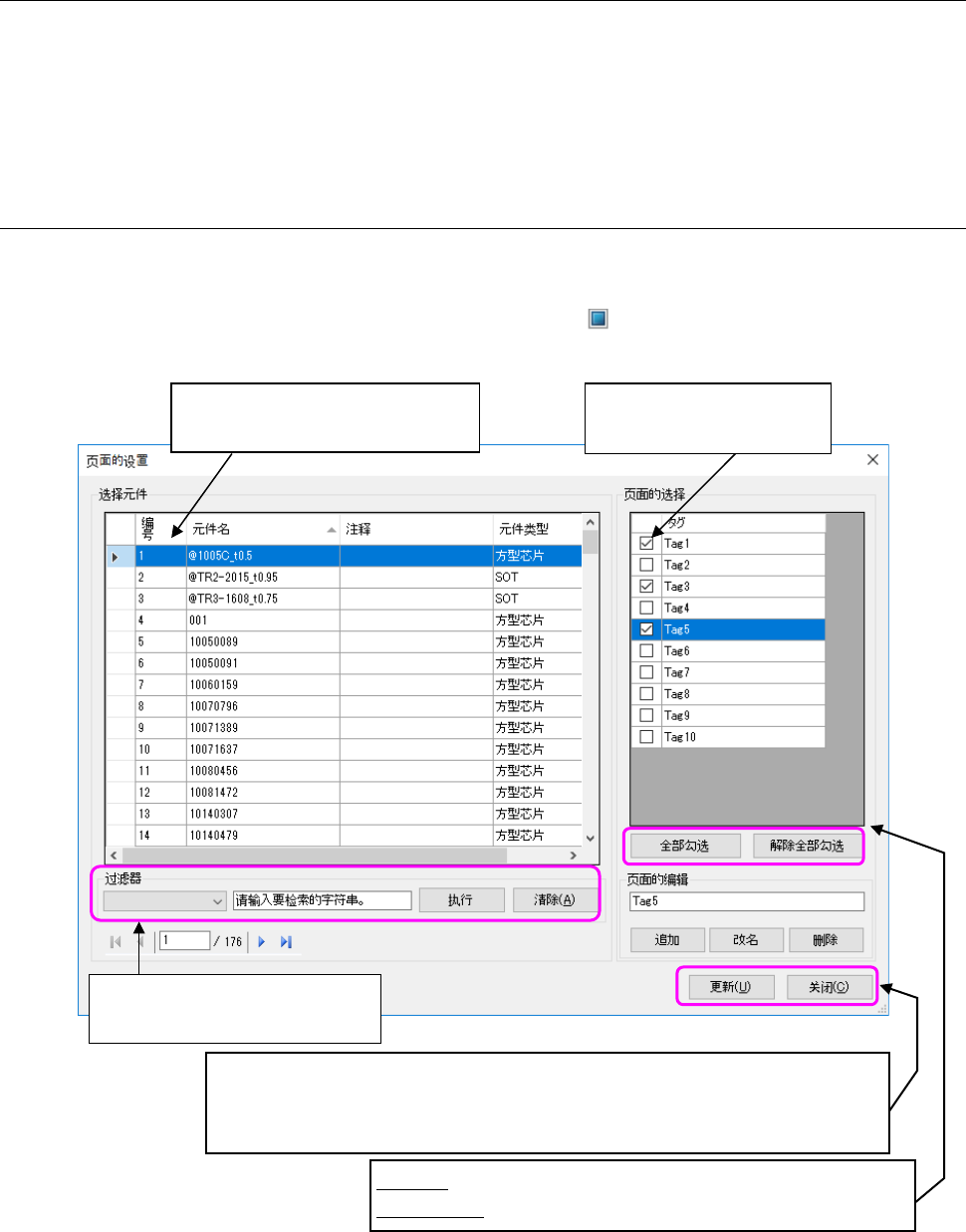 更新: 执行所选择行的元件数据和页面的关联操作。