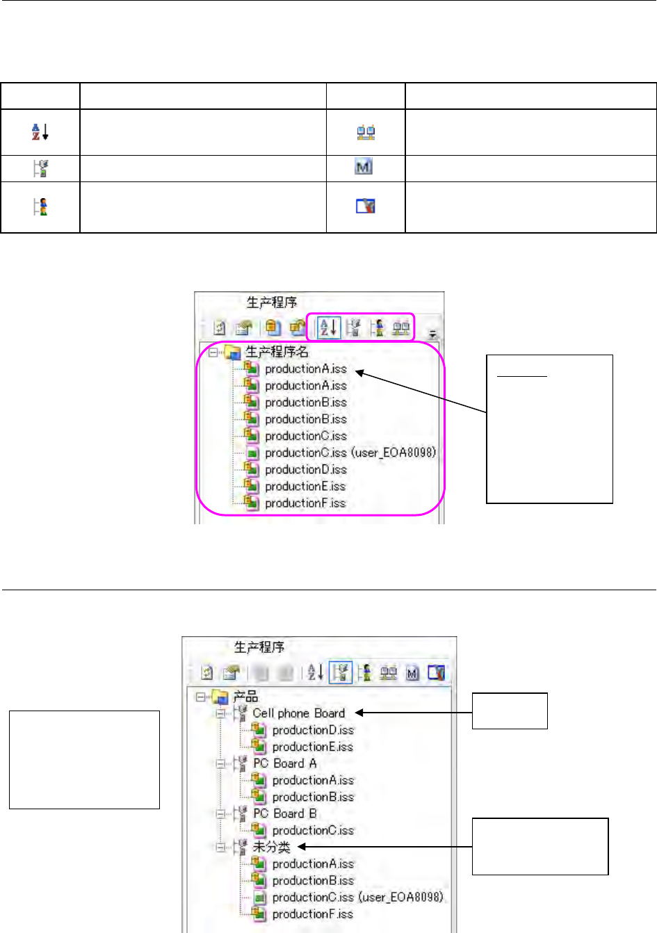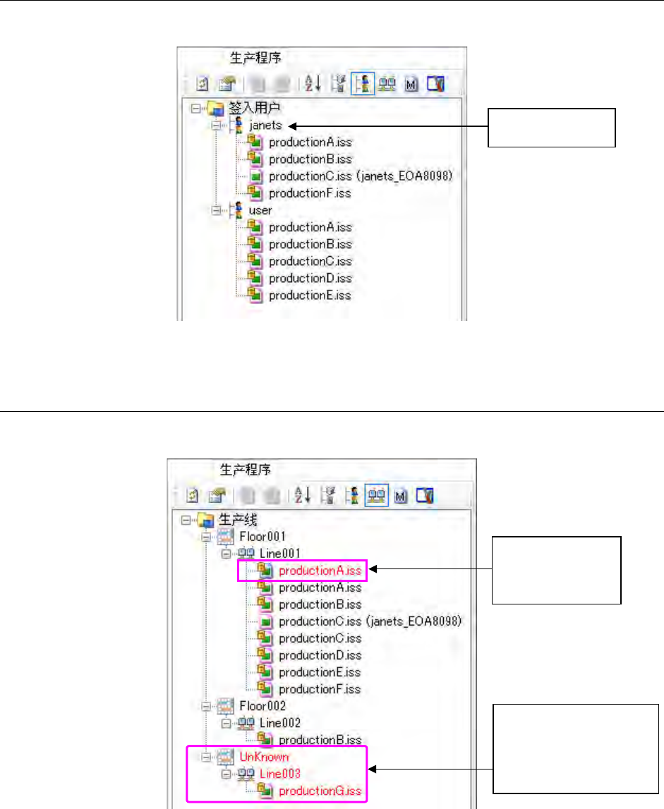JaNets 使用说明书 17 程序管理器 17 -4 17 -1-4- 2 生产程序‐按用户显示 按签入的用户名 分别显示。 图 17 -1-7 按用户显示 17 -1-4- 3 生产程序‐按生产线显示 按生产线显示。 图 17 -1-8 按生产线显示 签入的用户名 与数据库管理的实 际生产线构成的信 息不一致。 数据库里不存在的生产 线。 不属于任何车间,因此车 间会显示为“ UnKnown ” 。