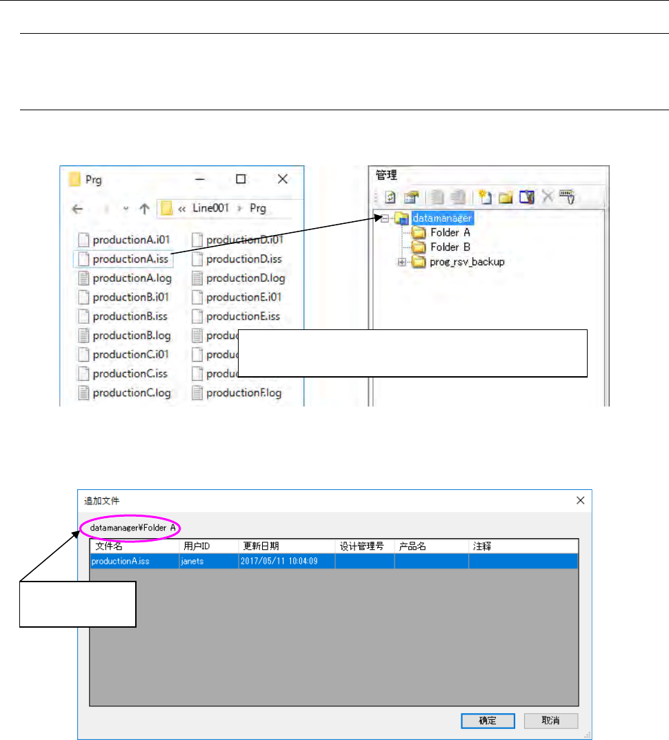 JaNets 使用说明书 17 程序管理器 17 - 10 17 - 3 操作步骤 17 -3- 1 对 数据库的操作 仅可从「管理」 画面进行操作。 17 -3-1- 1 向数据库注册生产程序 有如下 1. ~ 3. 的方法。 1. 进行如下①、② 的操作。 图 17 -3-1 文件注册 ( 左 :Windows 资源管理器、右 : 程序管理器 ) 在上面②的操作 后,会自动显示 确认文件注册 对话框。 图 17 -3-2 文件注册确…