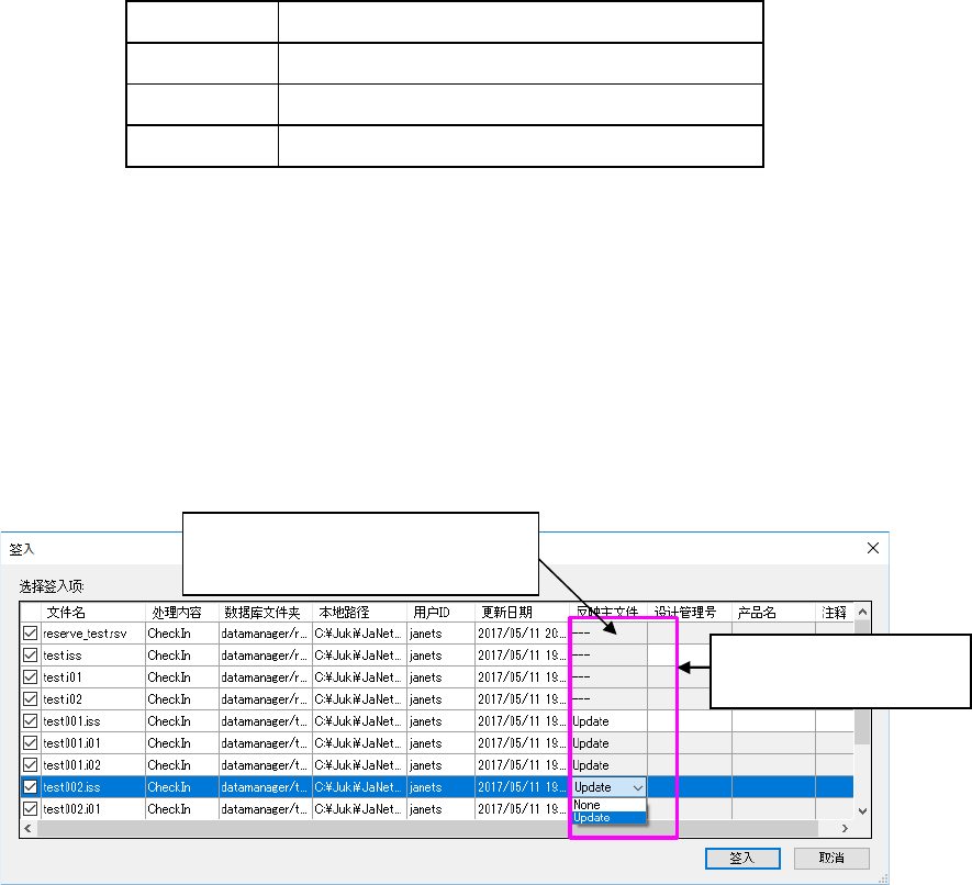 此时,在环境设置对话栏的「签入 主文件动作」中设置所选择的内容。