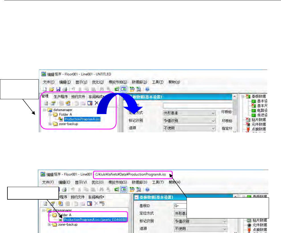 JaNets 使用说明书 17 程序管理器 17 - 38 ③ 用程序管理 器执行签入操 作,把客户端 PC 的 Prod uctionProgram A.iss 的内容反映到数据库 的 Productio nProgram A.iss 内容。 图 17 -9-3 签入后 ※ 签 入后,数据 库与客户端 PC 的 P rod uctionProgr amA.iss 内 容变为相同。 ※ 可以对 P ro ductionProgr amA…