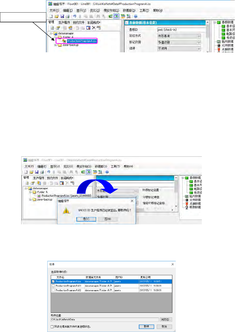 ③ 用程序管理器执行签入操作,把客户端 PC 的 ProductionProgramA.iss 的内容反映到数据库的