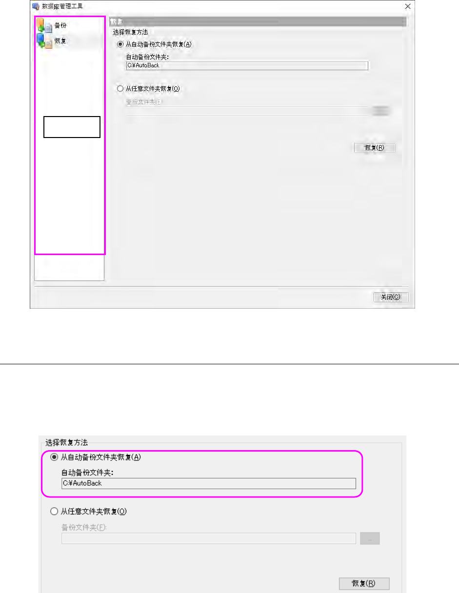 JaNet s 使用说明书 C 数据库管理工具 C-7 图 C-3-1 恢复画面 C-3-1-1 恢复方 法的选择 (1) 自动备份数据的恢复 要恢复自动备份 的数据时, 在 「恢 复画面」 中 选择 「从自动备 份文件夹恢复 」 。 按下 「恢复」 按 钮后,从「备份 画面」中设定的 「自动备份文 件夹」进行恢复 。 如进行恢复,所 有备份的数据将 复原到数据库 。恢复过程中数 据库不可使用 (脱机) 。 图 C-3-2 从自动备份文…