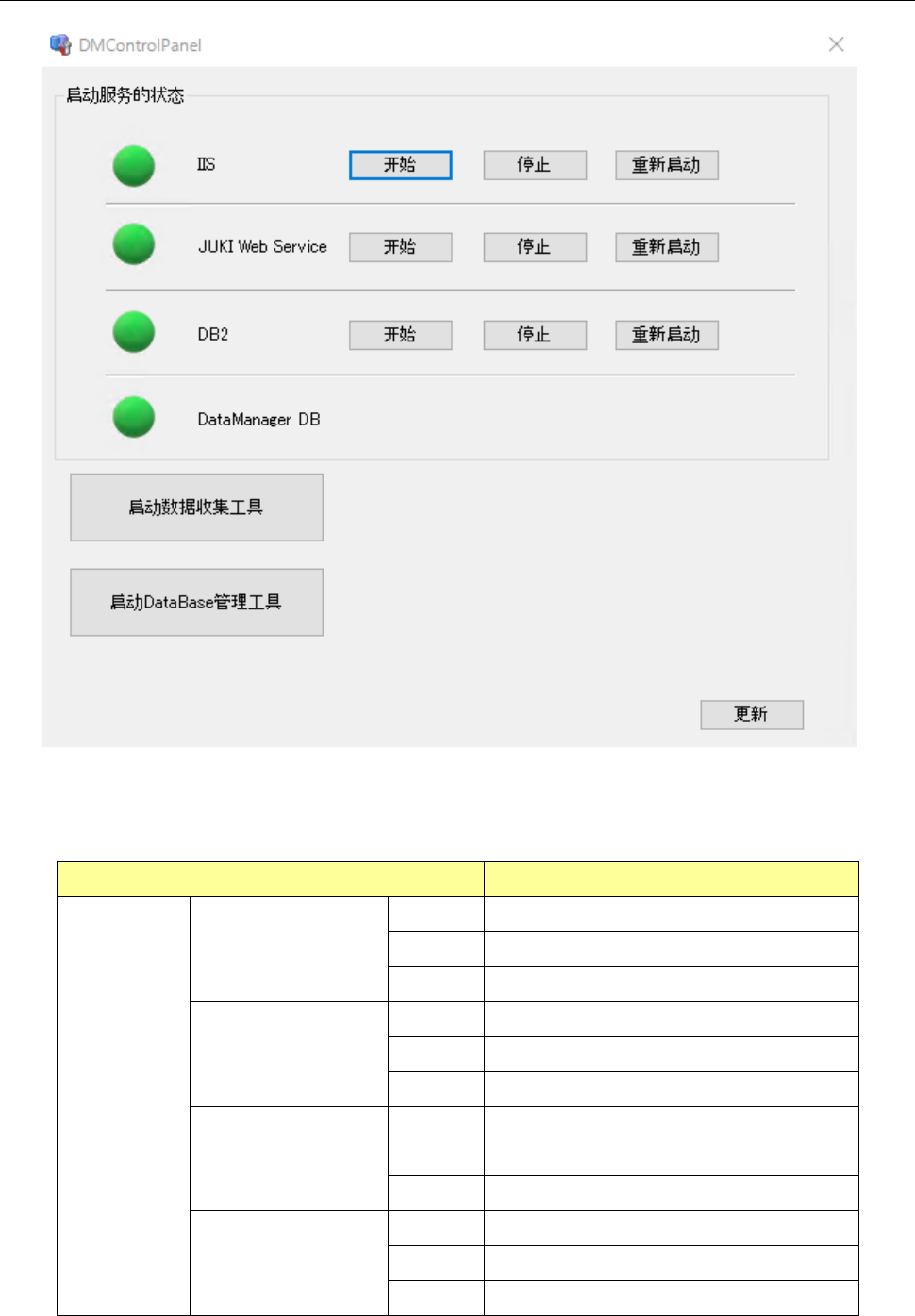 JaNets 使用说明书 D 数据库管理工具 D-2 D-1-2 画面构成 图 D-1-2 DMControlPanel 主 画面 表 D-1-1 DMControlPanel 画面说明 项目 内容 运行 服务 的 状态 IIS 开始 开始 IIS 。 停止 停止 IIS 。 重启 重启 IIS 。 JUKI Web S ervice 开始 开始 JUKI Web S ervi ce 。 停止 停止 JUKI Web S ervi ce…