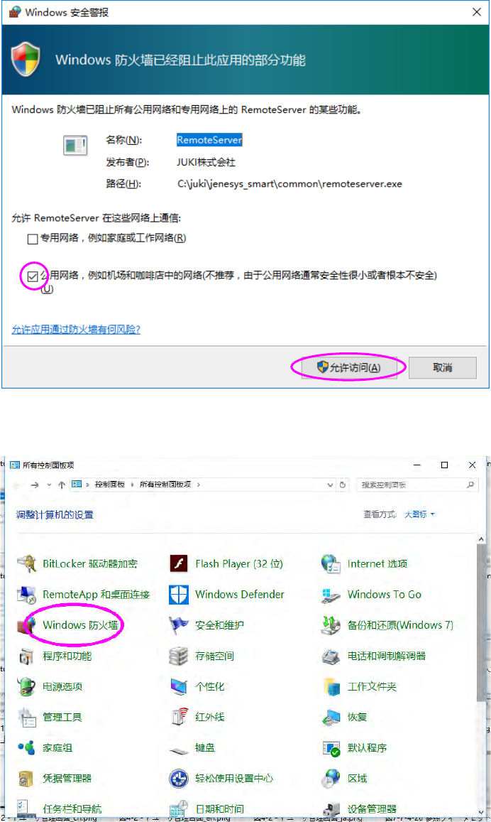 JaNets 使用说明书 3 平台 3-2 ※ W ind ows 防 火墙设定为有效 时 JaNets 平台( JaN ets Launcher )启动时 ,会显示安全警 告对话框,要 确认已勾选「公 用网 络」 ,再按下「 允许访问」 按钮。 如果未按上述设 定时,要通过「 控制面板」 ,打开「 Window s 防火墙」 。