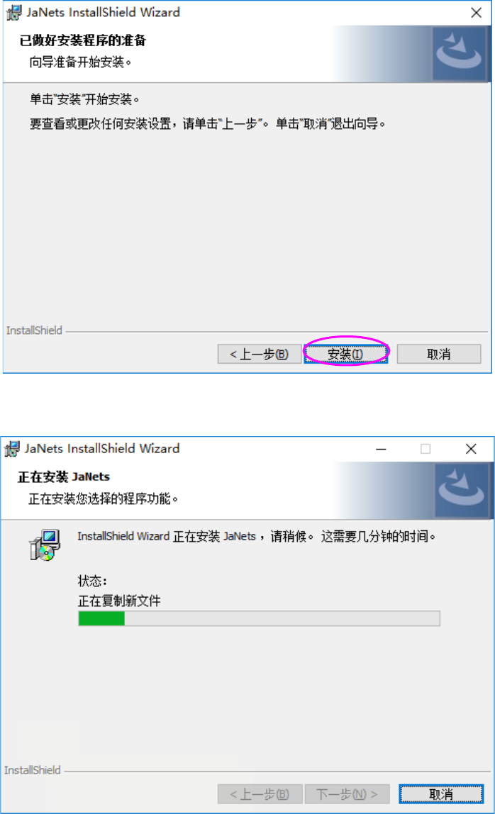 JaNets 使用说明书 2 安装 2- 11 (4) 单击「安装」后 ,即开始安装。 (5) 正在执行安装。