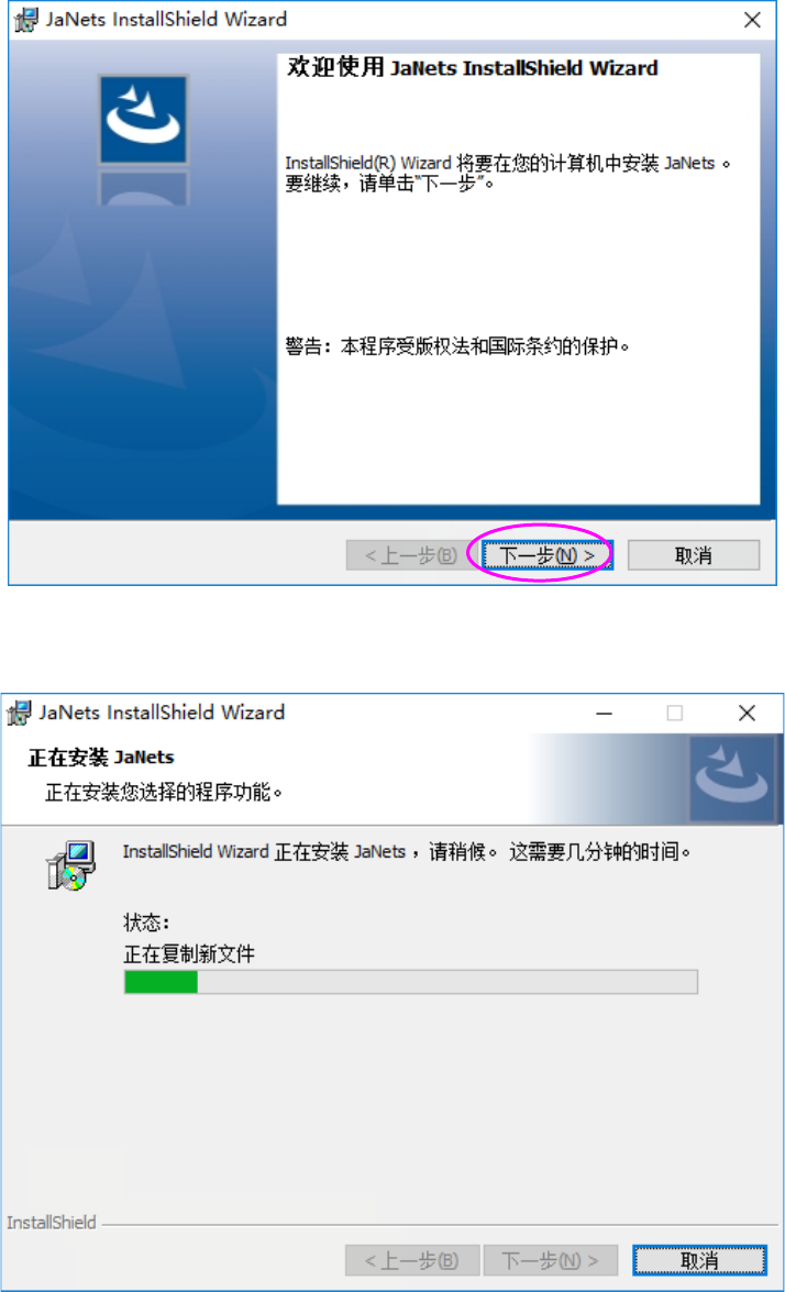 JaNets 使用说明书 2 安装 2- 15 (5) 请确认画面的信 息,点击「下一 步」 。 (6) 正在进行安装。