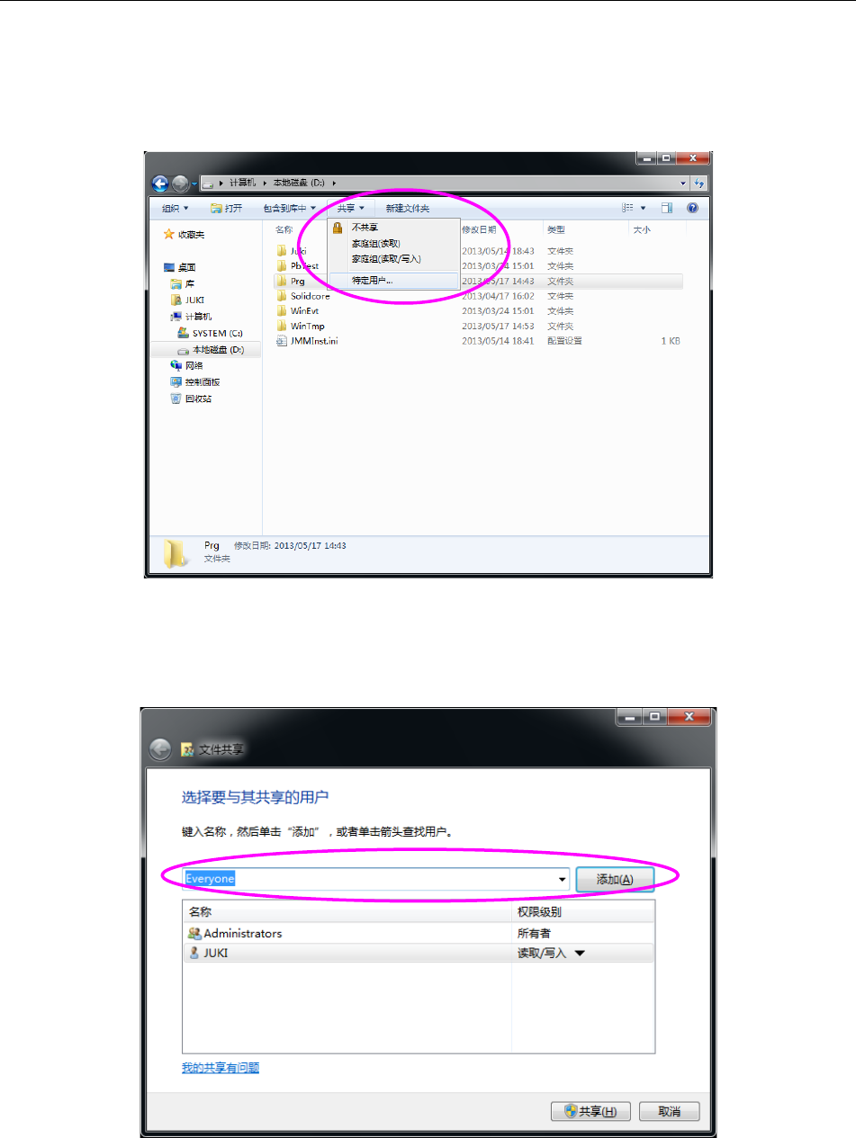 JaNets 使用说明书 2 安装 2- 38 2-5-1-3 设定共享文件夹 从程序下载器下 载生产程序时, 机器端必须要 有名为「 Prg 」的共享名的共享文 件夹。 ( RX -7 系列不需 要进行本设定。 ) (1) 启动 浏览器,在 D 盘的任意位置新建 P rg 文件夹。 (2) 在选择建立的 Prg 文件 夹的状态下, 选择「共享」 → 「特定用户」 。 图 2-5- 12 设定共享文件夹 (Windows7 ) (3) …