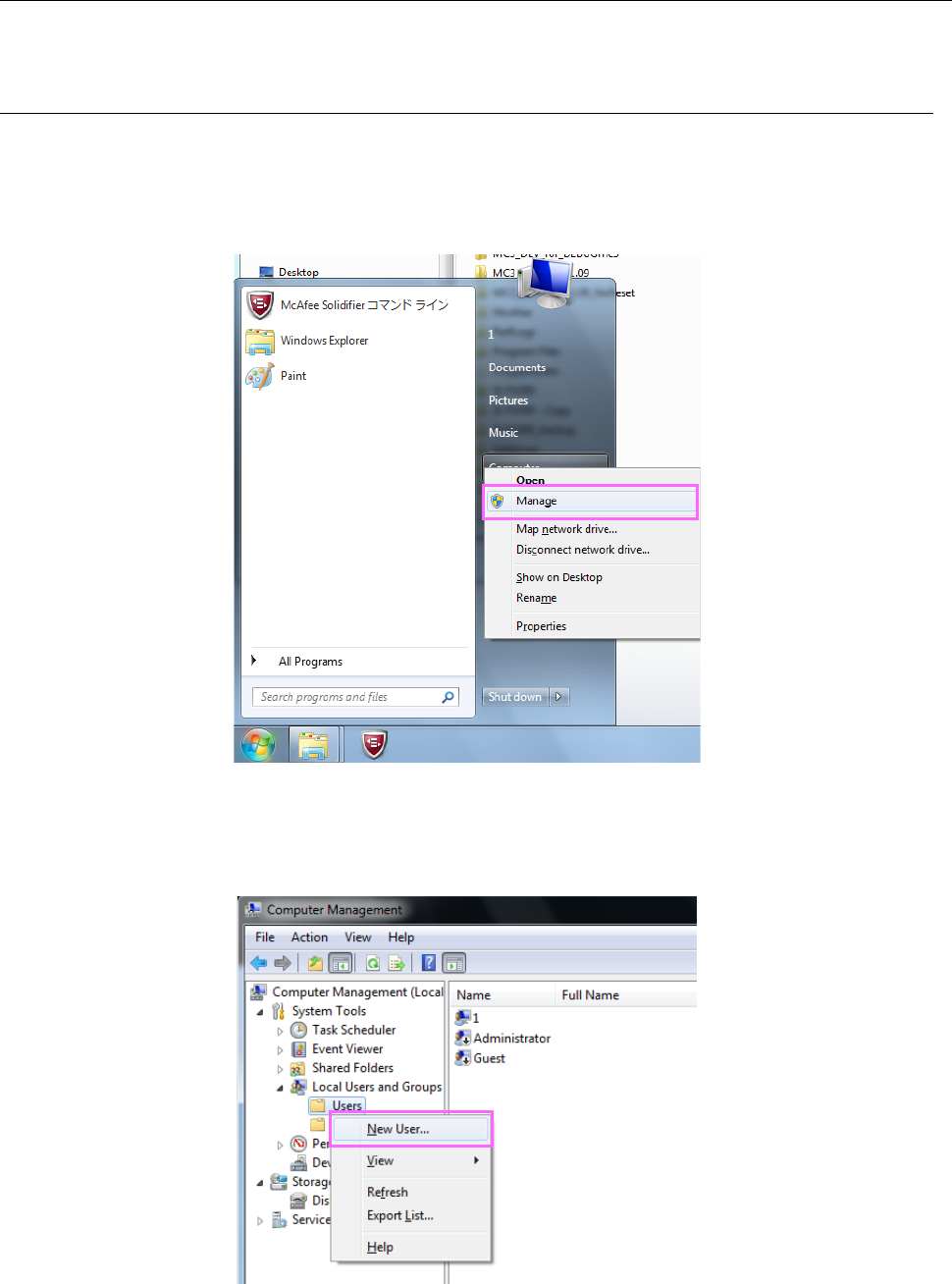 (1) 右击装置主体的 Windows 打开菜单中的「Computer」。 显示出菜单后,请点击「Manage」。