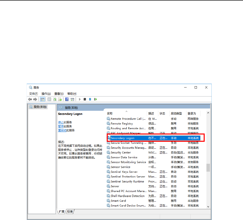 要启动通信应用程序,需要使 Windows 服务的『Secondary Logon』为有效。