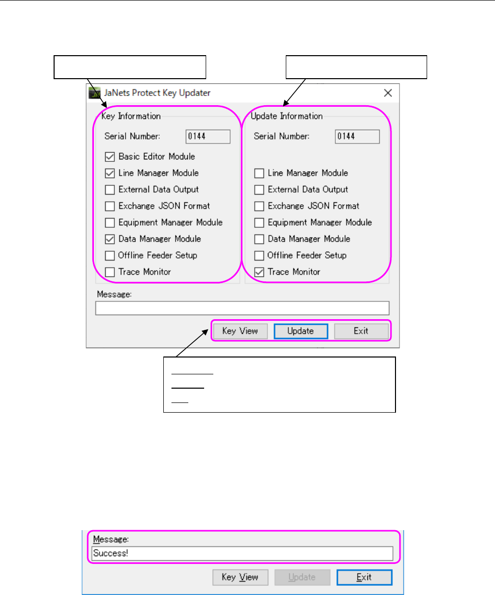 JaNets 使用说明书 2 安装 2- 64 2-6-3 追加 许可证 (1) 在 画面左 侧的 「 Ke y Inform ation 」 栏内显示 保护模块 的 许可证 信 息 ,在 画面右 侧的 「 Update Informat ion 」 栏中显示 J aNe ts 追加 许可证的信 息 。 图 2-6-1 启动更新保护模块 的 应用程序 (2) 确认 内容后, 请按下 「 Update 」 按钮。 开始更新 保护模块。 更…