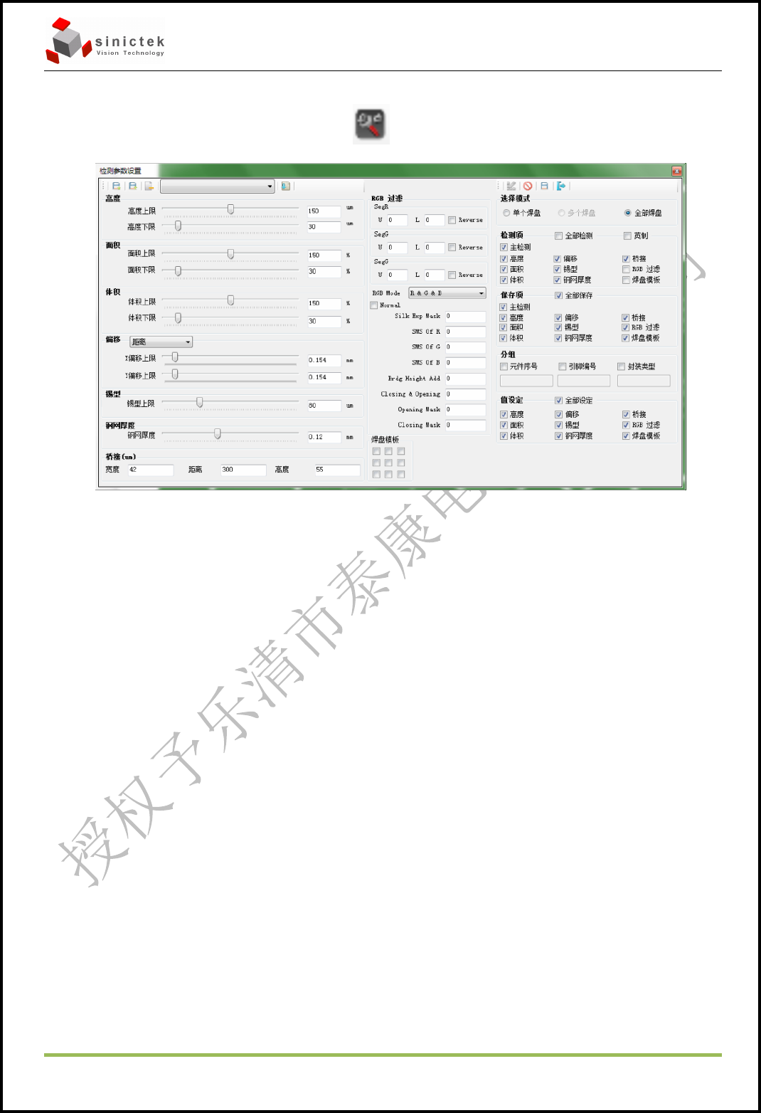 3D SPI 操作手册 思泰克光电 科技有限公司 Page 30 Copyright by Sinic-T ek V isi on T ec hnolog y Co., L td. 5.2.6 对检测指标的范围进行设定 对检测工艺范围进行设定,点击 ,弹出以下窗口 5.2.6.1 Check 选择你要检测的项目。 (例如选定 Check Area,则会对面积进行 检测,不选择则不检测。 ) - Check Height 检查高度; - …