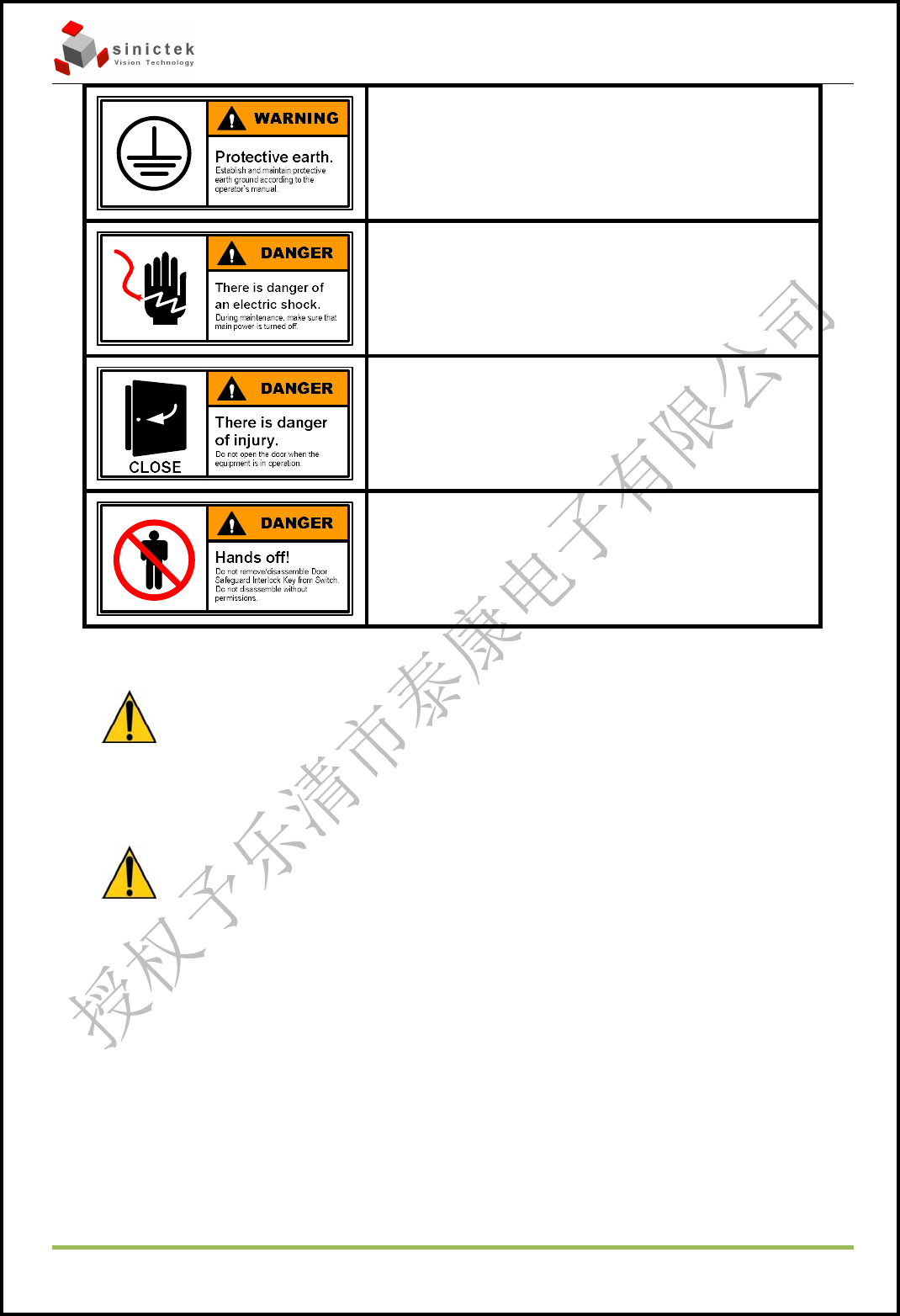 3D SPI 操作手册 思泰克光电 科技有限公司 Page 5 Copyright by Sinic-T ek V isi on T ec hnolog y Co., L td. 警示: 根据使用说明书的 要求建立及 维护接地。 危险: 在对设备进行维护 时,确保主 电源已经被 关闭。 危险: 在设备运行过程中 ,确保设备 的门已经被 关闭。 危险: 在 未 经 许可 的 情 况 下 , 禁 止移 动 ,屏 蔽 或 拆 卸 设 备中任何…