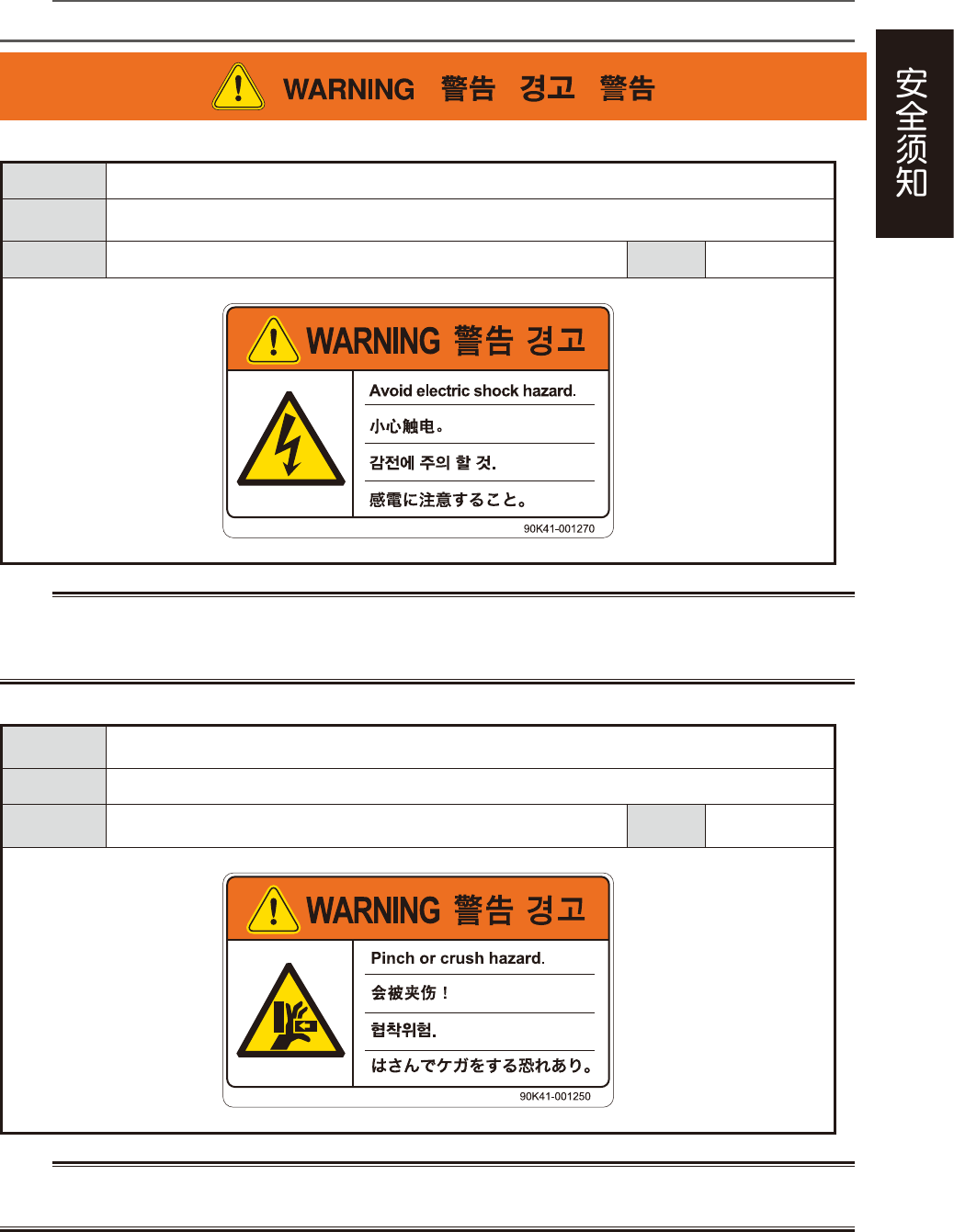 张贴位置 电源主控开关、安全机盖内部 警告阶段 所有作业