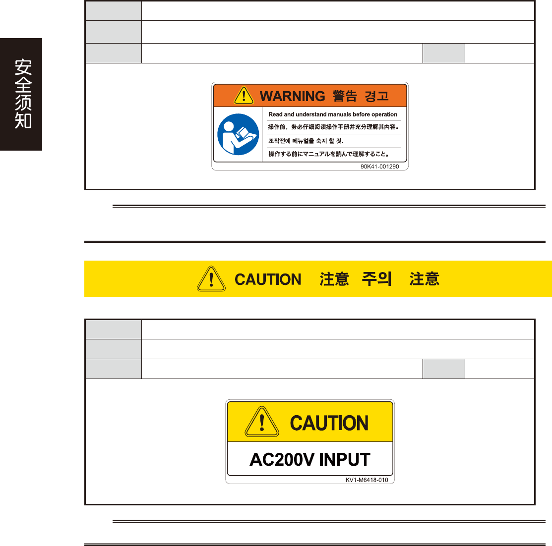 请勿撕毁或覆盖警告标贴。万一警告标贴因脏污或破损而无法阅读时,请务必与销售代理商或直接与本公司联系,重新将相同标贴