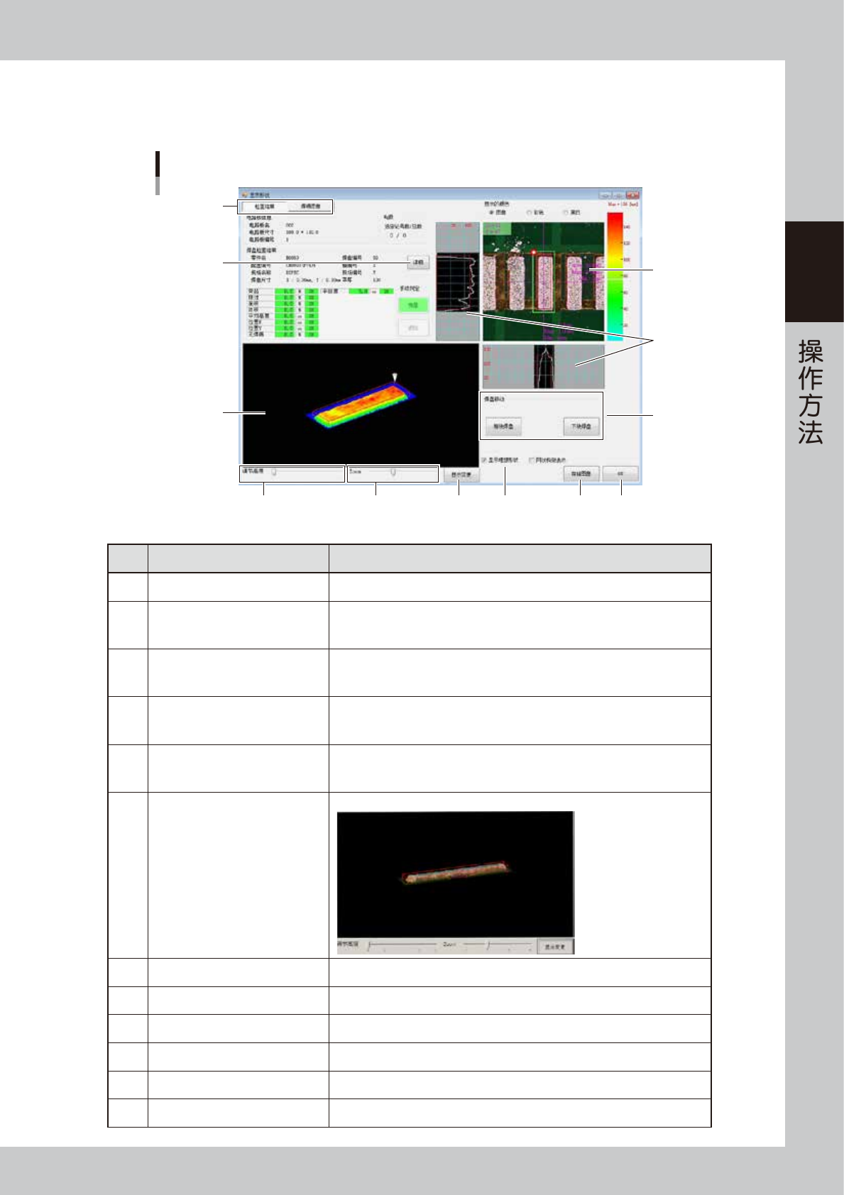 9 [ 显示变更 ] 按钮 在三维图像上以色阶显示高度。