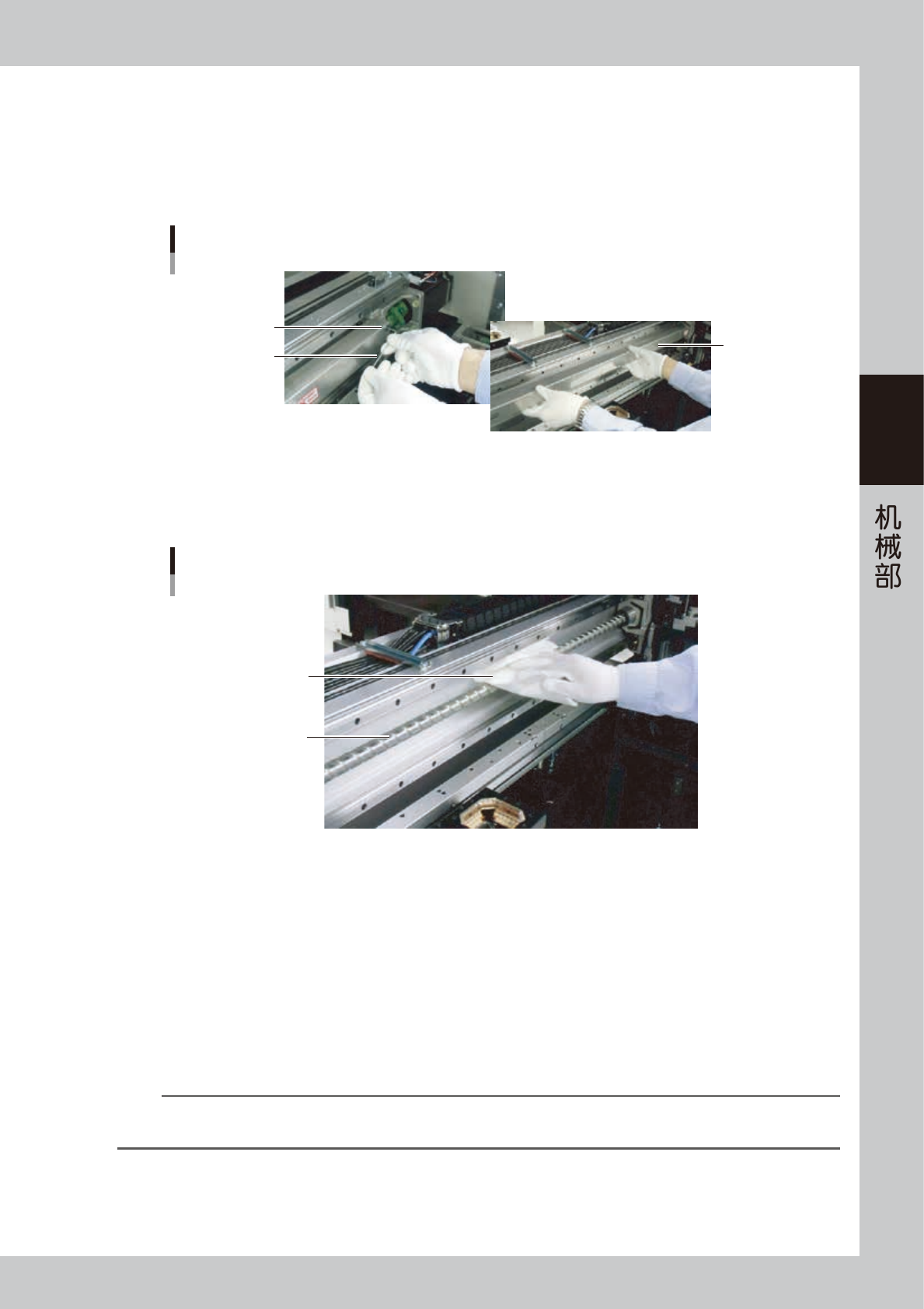 3-16 3 2.2 X 轴 如因加油不足或润滑脂老化而发生粘着,使滚珠或滚珠滚动面受损,可能导致 X 轴滚珠丝杠损坏或发出异响。 建议每月加 1 次润滑脂。 另外,建议每 2 个月拆卸 1 次 X 轴护盖,清洁滚珠丝杠后涂抹润滑脂。请按以下步骤添加润滑脂。 2.2.1 X 轴滚珠丝杠 c 注意 • 请务必使用不起灰尘的棉纱擦除脏污的润滑脂。 • 请务必添加本公司指定的润滑油。( 请参阅后述第 5 章 “2.消耗…