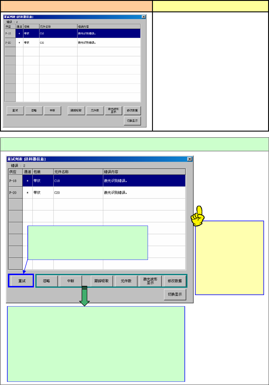 操作手册Ⅰ 2 3- 3-2 用完元件 (操作选项中未选中“无元件暂停”时) 可贴装的所有元件贴装完毕后显示下列画面,装置进入暂停状态。 错误画面 错误要因、原因 ①用完元件。 ②元件吸取错误 (因带子剥离缠住、 传送不良等造成 的吸取位置偏离等) 。 处理错误的方法 ☆ 忽略 :跳过用完的元 件,进行下一个基板的生产。 ☆ 中断 :中断生产。 ☆ 跟踪吸取 :用摄像机,进行吸取 位置的校正处理。 ☆ 元件数 :可设置元件数量。 ☆ 激…