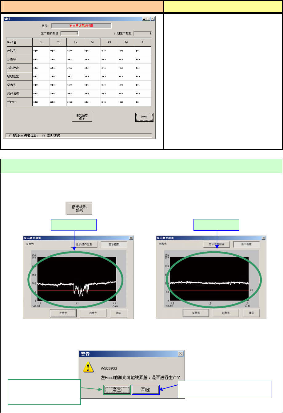 操作手册Ⅰ 4 3- 3-4 激光脏污 如果选中操作选项 “生产(功能 2)” 标签 中的“进行激光传感器 脏污检查” ,则搬 入基板时会进行激光脏污检查, 检测出激 光脏污时会暂停。 ①激光视窗有脏污。 ②激光视窗有伤痕。 处理错误的方法 1) 遇到「激光脏污错误」时,贴片头将移动到前面后暂停。 2) 请参照『操作手册Ⅱ』「 5-3-4 激光校准传感器」,清扫激光视窗。 3) 清掃后请按下 ,在「激光波形显示」画面上确认是否去除了脏污…