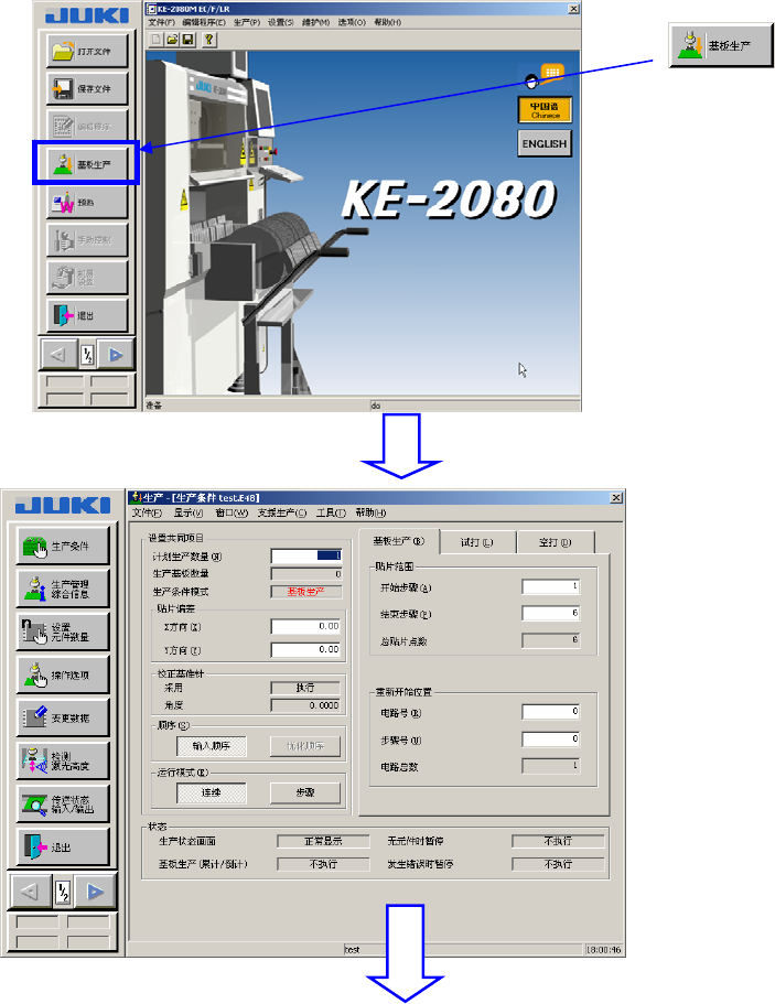 操作手册Ⅰ 5 2- 步骤 4 选择生产画面 ① 请在主画面上选择 ② 显示生产画面。 ※ 需要根据生产基板的宽度设置传送宽度时 ✡请进入『步骤 5 』 。 ※ 不需要设置传送宽度等时 ✡请进入『步骤 6 』 。