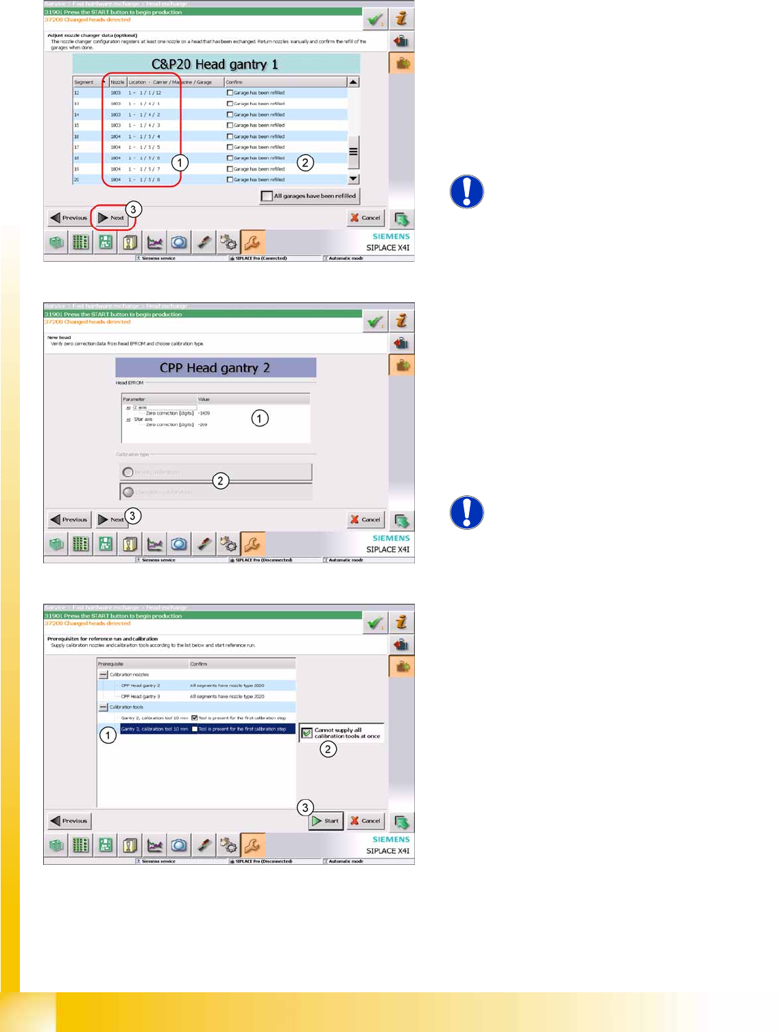 Calibration Fast Head Exchange Additional Functions S tudent Guide (FSE) SIPL ACE X Series and X4I Edition 01/2009 EN Calibration 51 1 1. Confirm the action with Start . A complete machine reference run will be performed…