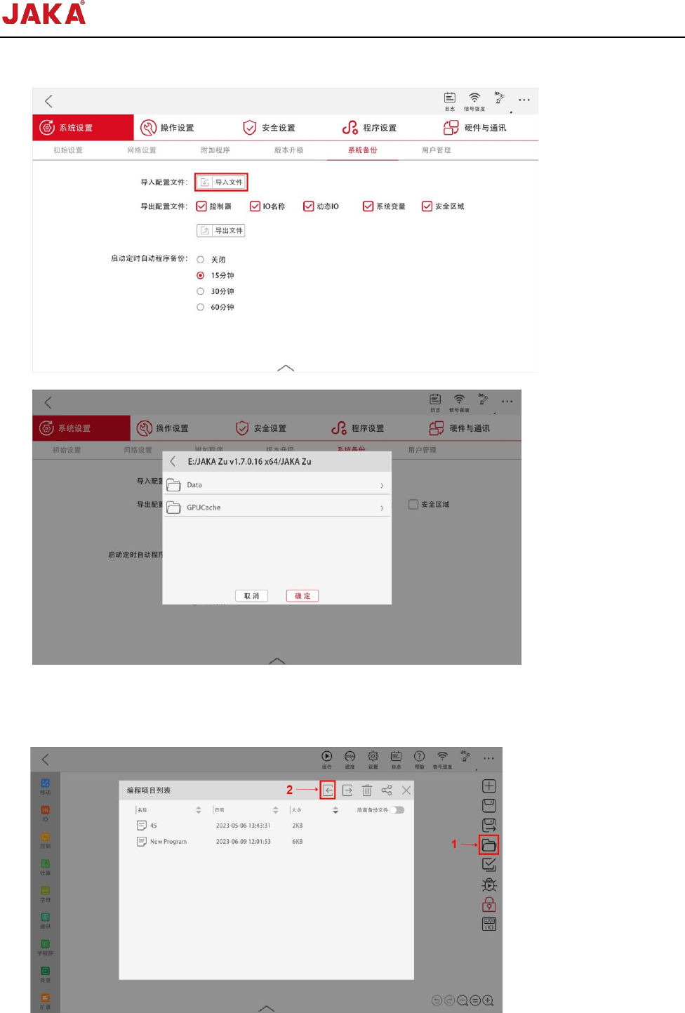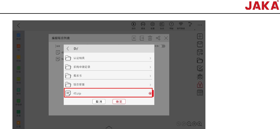 文档版本: 3.1 101 / 201 节卡服务手册 注:配置文件导入后, 需重启控制柜。 2. 进入编程控制界 面,点击程 序列表,点击导 入按钮,选 择备份文件的存 储路径,选 择要导入的相应 程序文件,点击“确认 ”进行导入;
