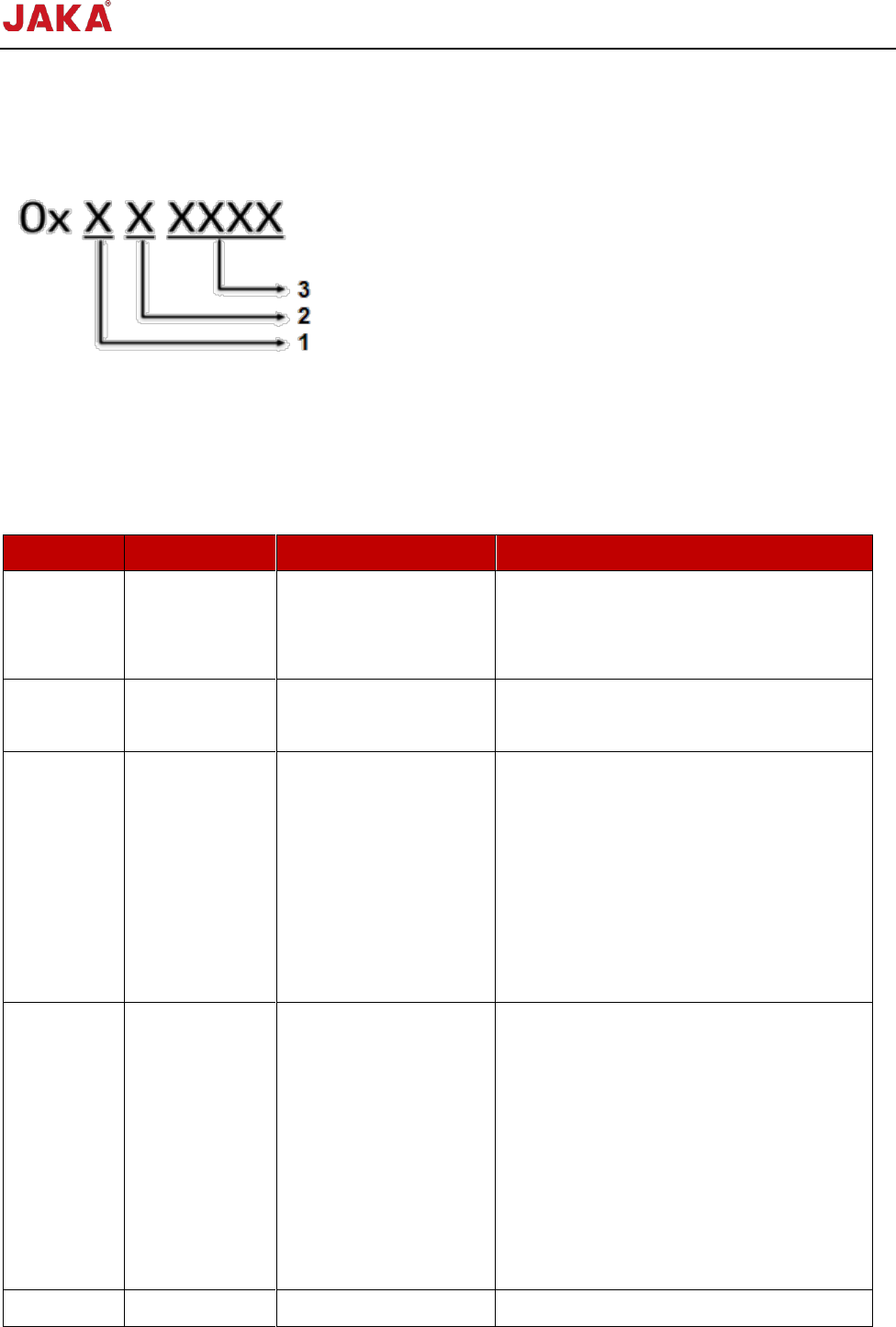 文档版本: 3.1 123 / 201 节卡服务手册 附录 附录 一:错误代码表 错误来源: 0 :控制器 1 :伺服 F : APP 报错关节: 0-5 :关节 1 至关节 6 F : APP 错误代码 描述 原因 措施 0x0F0001 机器人本体未上 电 控制器执行指令时,检 测到机器人未上电 确认机器人本体电源是 否打开;如果机器人 本体电源未打开,请首 先打开机器人本体电 源 0x0F0002 机器人未使能 控制器执行指令时检…