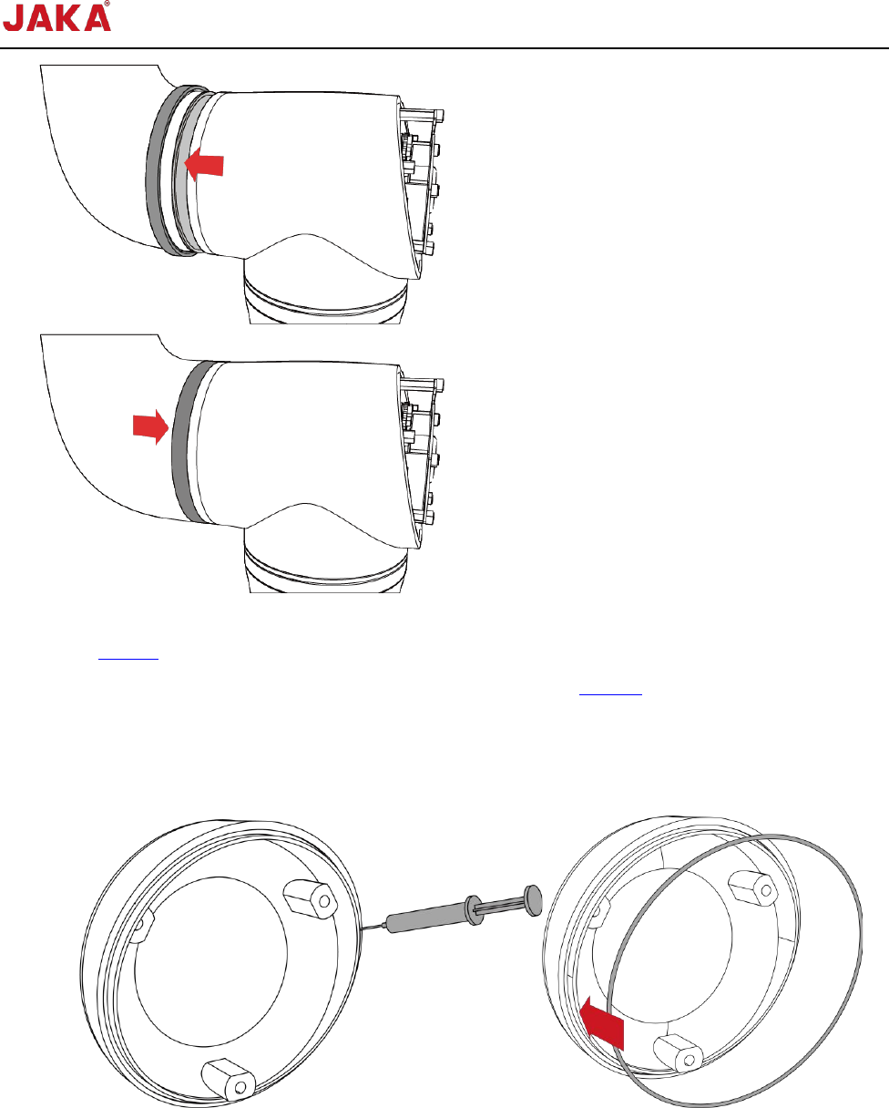 文档版本: 3.1 30 / 201 节卡服务手册 10. 逆时针旋转更换 部件,将螺栓主体旋 入至葫芦孔的 小孔内; 11. 使用开口扳手轻 轻拧紧固定六角螺栓 ,然后使用扭矩扳 手按对角顺序拧紧,拧 紧顺序见 2.2.2 ; 12. 将灰色的耐磨圈 滑入到位,再将密封 圈移动到耐磨圈上 ;