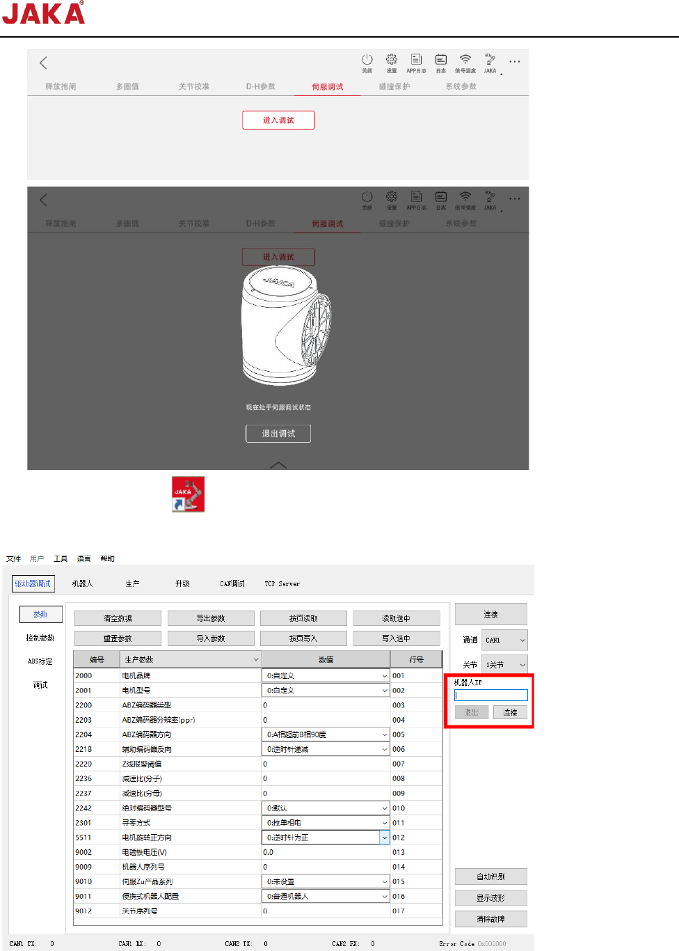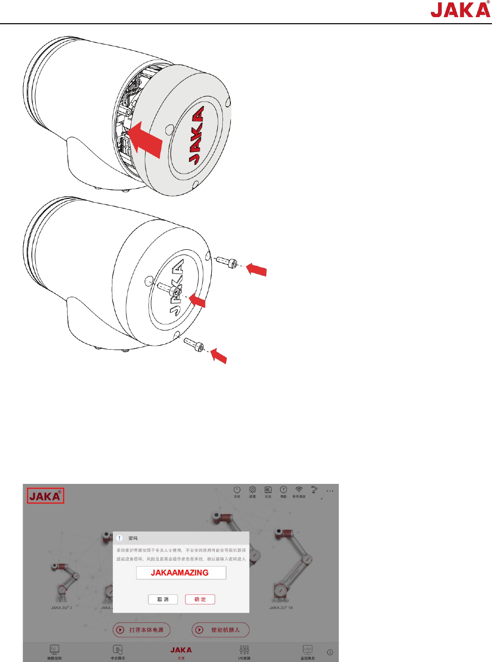文档版本: 3.1 32 / 201 节卡服务手册 2.2.4 升级程序 当更换关节后,为保证 关节正常运行,需进 行如下操作。 2.2.4.1 关节序列号写入 1. JAKA Zu APP 连 接机器人,并使机 器人处于上电、下 使能状态; 2. 连续点击页面左上角“ JAKA ” , 输 入 密 码 , 点 击 “ 确 认 ” , 进 入 系 统 维 护 界 面 ; ( 注 : 密 码 是 JAKAAMAZING ); 3. 点击【…