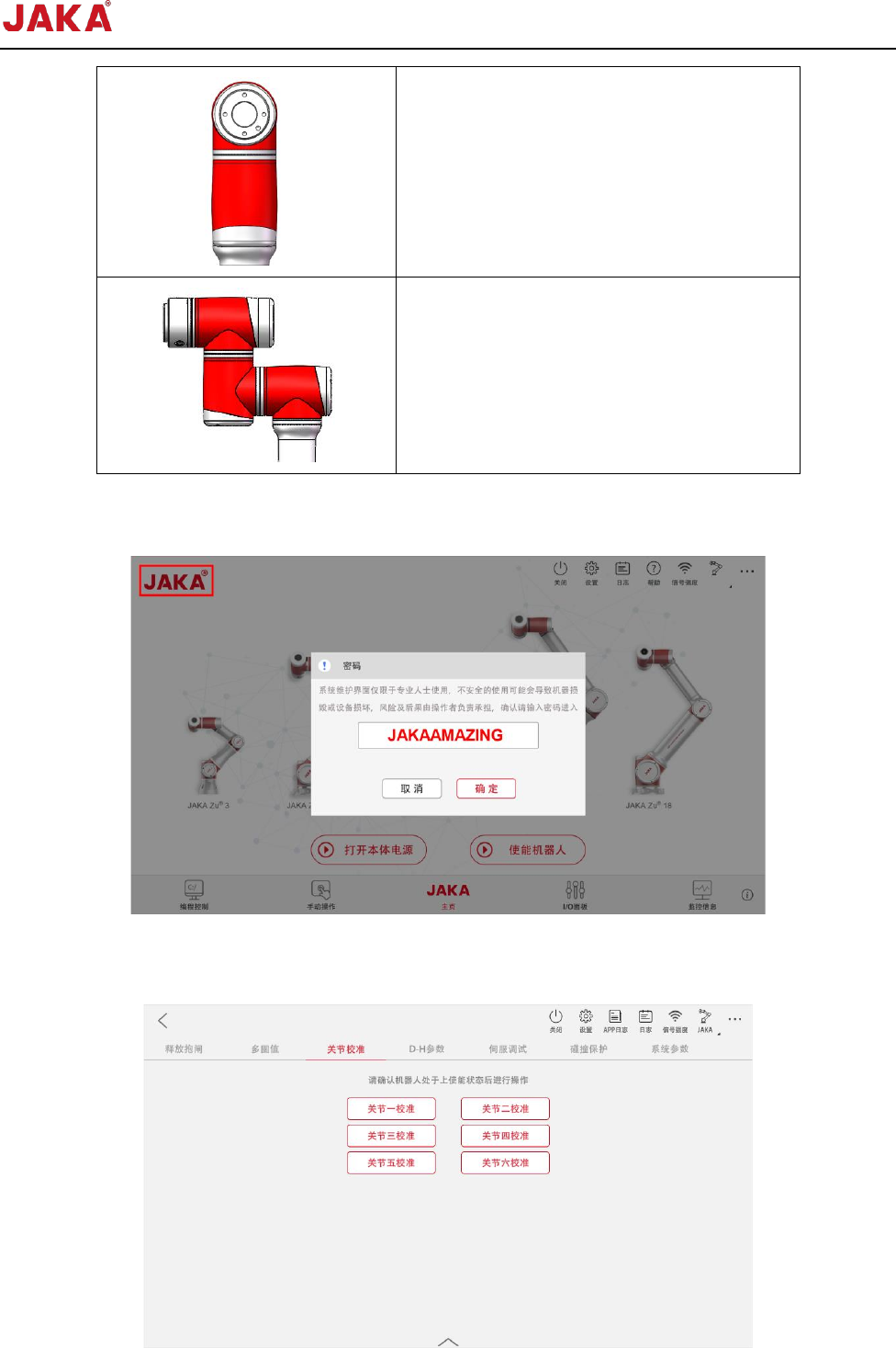 文档版本: 3.1 37 / 201 节卡服务手册 关节 4 位置: 使关节 5 轴线处于竖直姿态 ; 关节 5 位置: 使关节 6 轴线与关节 4 轴线平行。 关节 6 位置: 使末端法兰上 TIO 接口朝 正上方。 3. 将机器人移至关节校准 姿态后,返回首页, 连续点击页面左上角 “ JA KA ” ,输 入密码,点击“确 认” , 进入系统维护界面 ; (注:密码是 JAKAAMAZIN G ) 4. 点击【关节校准】 ,选择需…