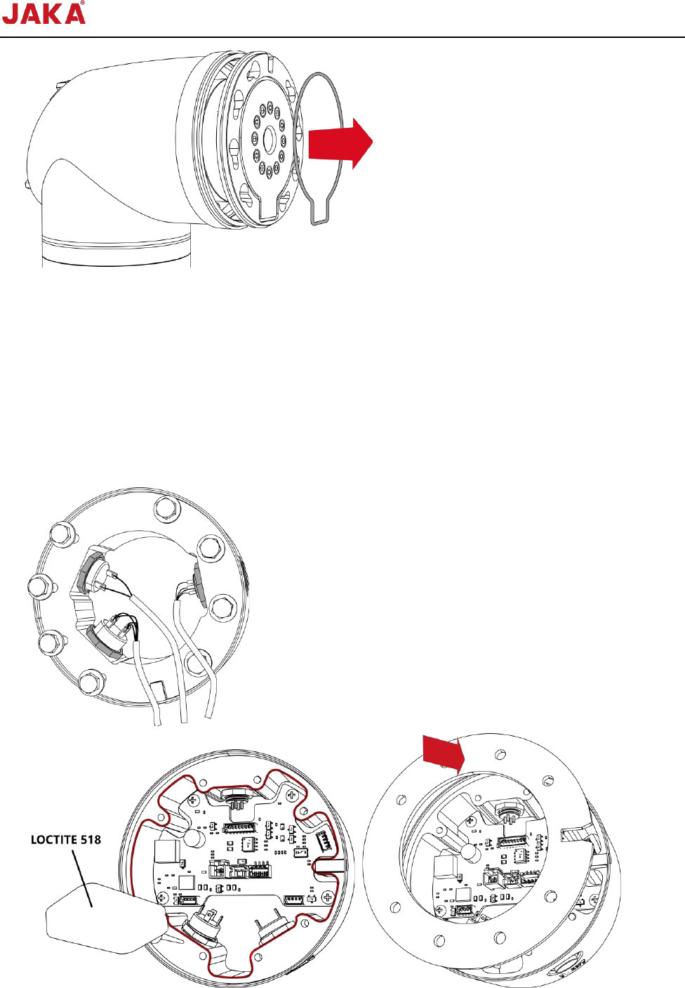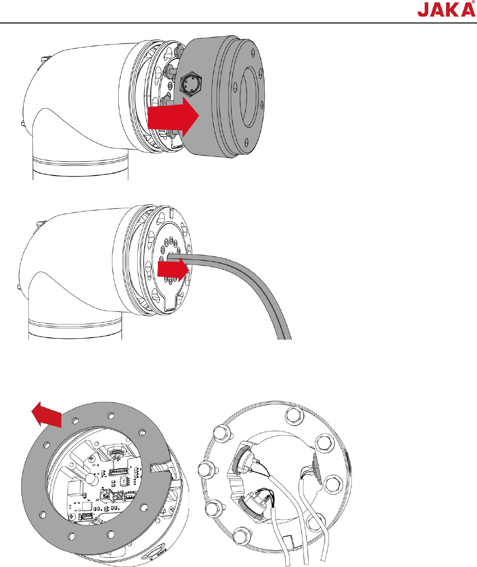 文档版本: 3.1 52 / 201 节卡服务手册 9. 将线束从关节 6 法兰面中心 孔中拔出; 10. 如需保留 TIO 、 FREE 、 POINT 按钮,可使 用开口扳手旋松固定 三条线束的六角螺 母,并将三条线束 取出。 注: Pro12 末端法 兰上有密封板,应 先使用开口扳手将 密封板拆下后再取出线 束。 11. 取下关节 6 法兰面黑色 O 型 圈。