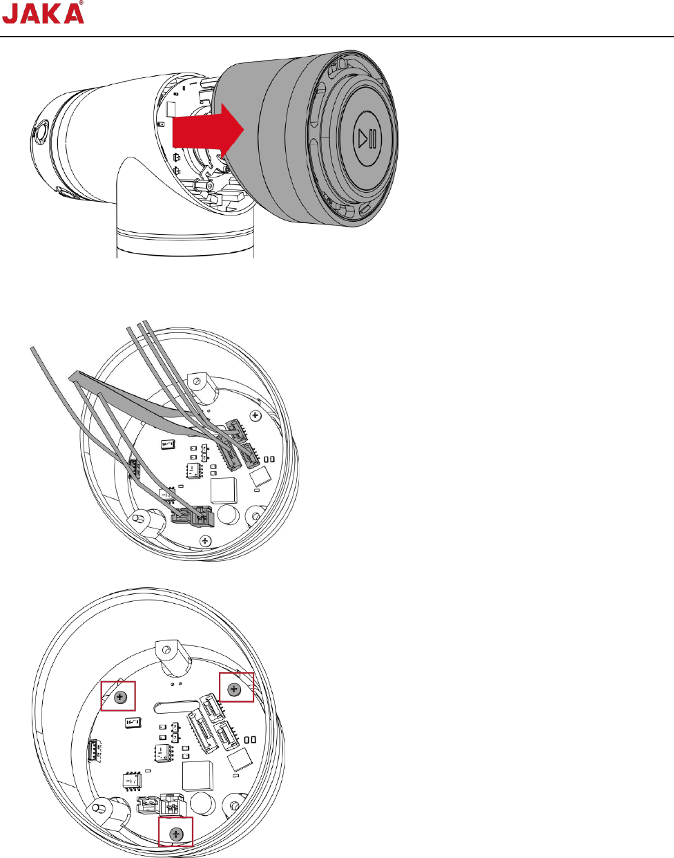 文档版本: 3.1 68 / 201 节卡服务手册 注:以下步骤以 A 类更换为 例, B 类步骤相同 。 2.7.3 末端灯拆卸 1. 保持手部干燥并佩戴防 静电手环; 2. 断开控制柜电源; 3. 使用一字螺丝刀撬开白 色透光壳; 4. 使用内六角扳手旋出 3 颗螺 钉,拆下末端灯盖; 1. 末端灯接口 2. 薄膜按键接口