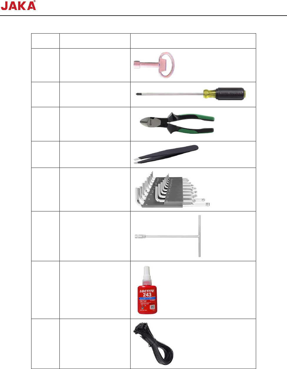 文档版本: 3.1 77 / 201 节卡服务手册 3.1.2 准备工具 序号 名称 示例图 1 控制柜钥匙 2 十字螺丝刀 3 斜口钳 4 镊子 5 内六角扳手 6 套筒扳手 7 LOCTITE243 螺 纹胶 8 扎带 3.1.3 风扇及防尘罩更换 3.1.3.1 防尘罩更换 1. 保持手部干燥并佩戴防 静电手环; 2. 取下风扇外侧的两个防 尘罩; 3. 取下防尘罩内的两个防 尘海绵;