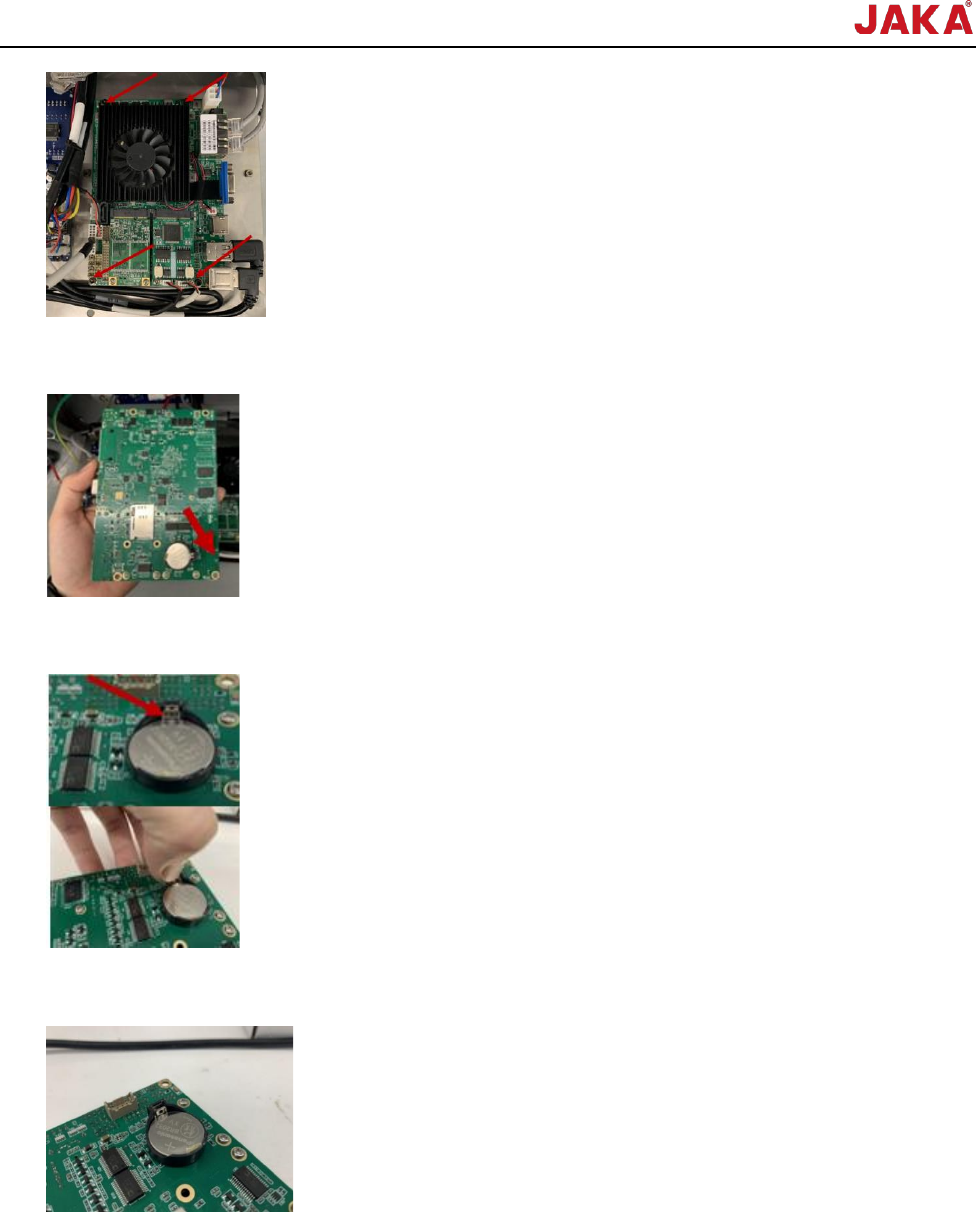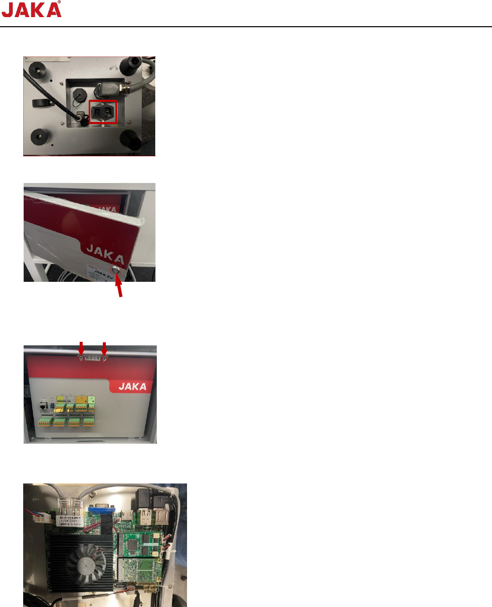 文档版本: 3.1 93 / 201 节卡服务手册 2. 关闭控制柜电源 ; 3. 使用控制柜钥匙 打开控制柜门; 4. 使用十字螺丝刀 旋松控制柜前面板上 的 2 颗螺钉, 打开控制柜前面板; 5. 拔下工控机上的 所有连接线,在拔线 前可以拍照记录接 线方式; 6. 使用内六角扳手 旋松固定工控机的 4 颗螺钉;