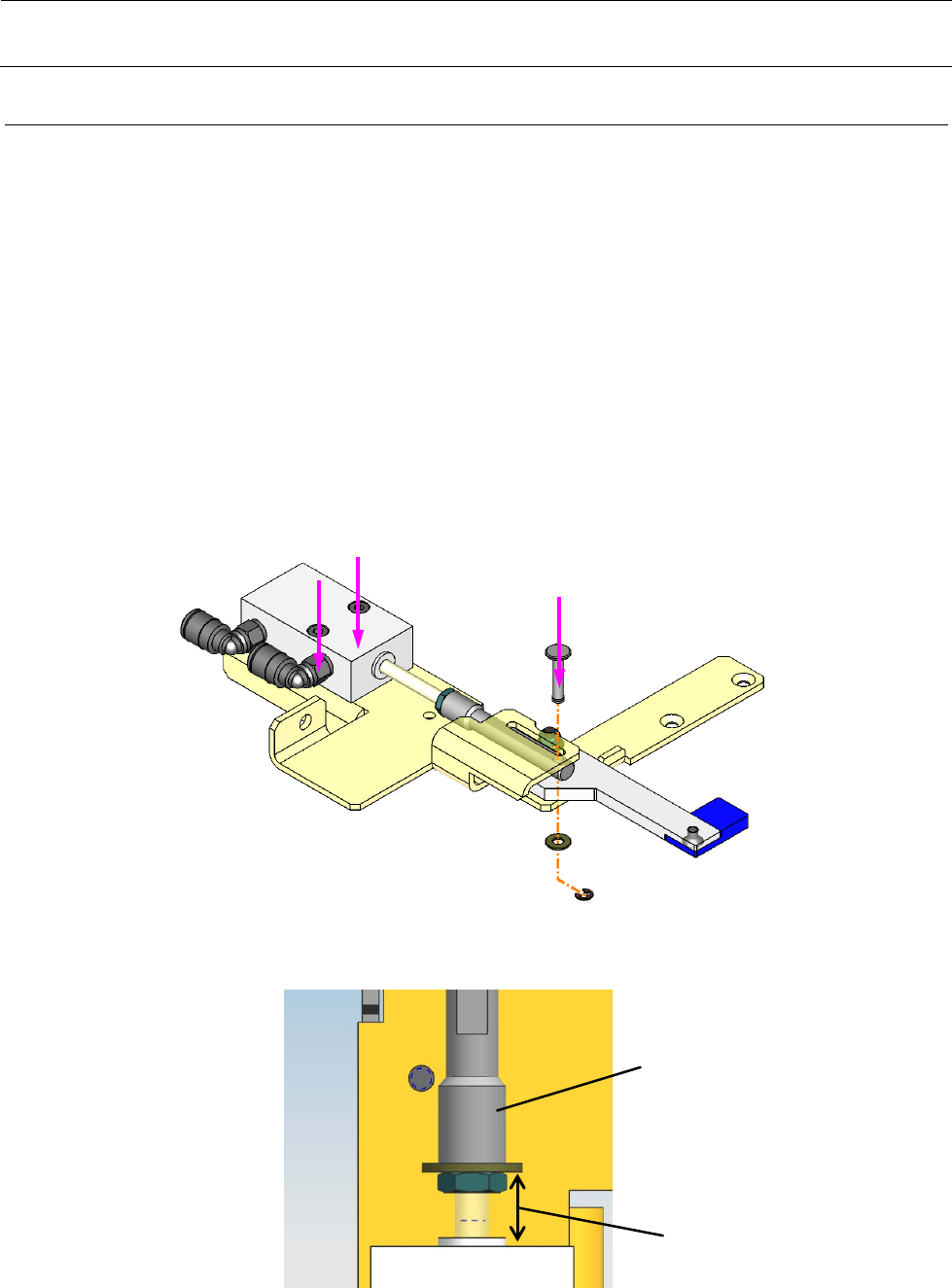 维修调整要领书 5- 35 5- 15 - 2 限动器气缸的更换 1) 释放本体空气。 2) 拆下气缸所连接的空气管子。 3) 气缸拆下每个塞机械限动器连接。 4) 拆下气缸止动连接器。 5) 拆下关节。 6) 更换气缸。 7) 组装时请按相反的操作顺序进行。 ※ 注意汽缸杆的长度调节和止动连接的。 ※ 气缸请组装在活塞杆可平稳移动的位置上。 ※ 请注意空气管子的连接。 图 5- 1 5 - 2- 1 限动器气缸的更换 图 5- 1 5…