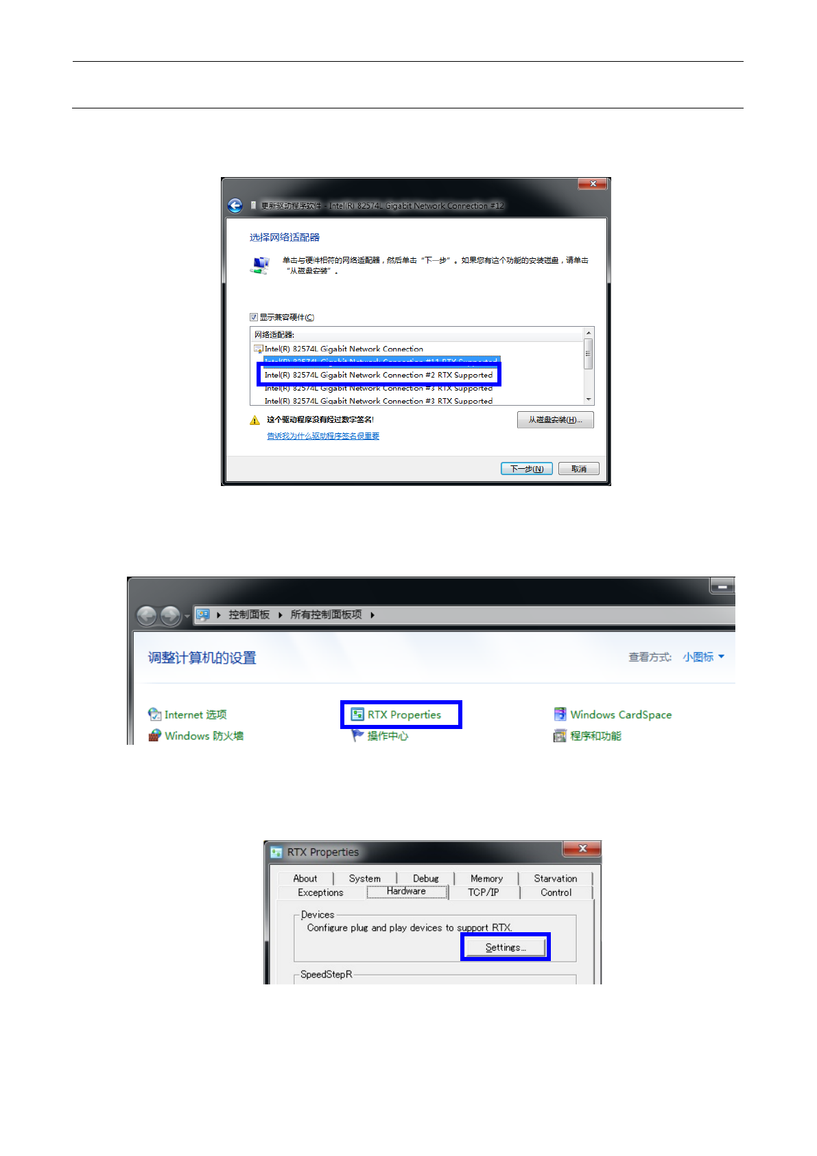 维修调整要领书 12 - 18 5) 选择“ Int el (R) 825 74L Gigabit Netw ork Connection # 2 RTX Suppor ted” 进 行安装 。 6) 从控制面板 上启动“ RTX Properties” 。 7) 选择“ Har dware ”选项卡, 按下 Devices 的 Se tti ngs …按钮。 显示设备树。
