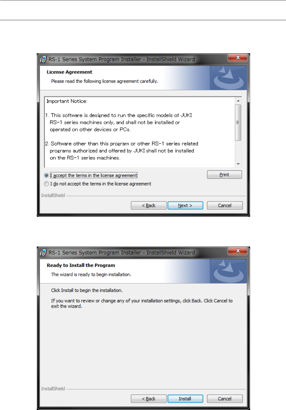 维修调整要领书 6) 显示关于使用许可协 议的确认画面。 勾选 [I acc ep t the ter m s in the l i cense ag r eem ent] ,点击 [Next] 按钮, 进到 7 ) 。 (继续前进时需要接 受告知事项。 ) 7) 显示安装开始前的确 认画面。 请点击 [in stall] 按钮进 到 8 )。 13 - 20