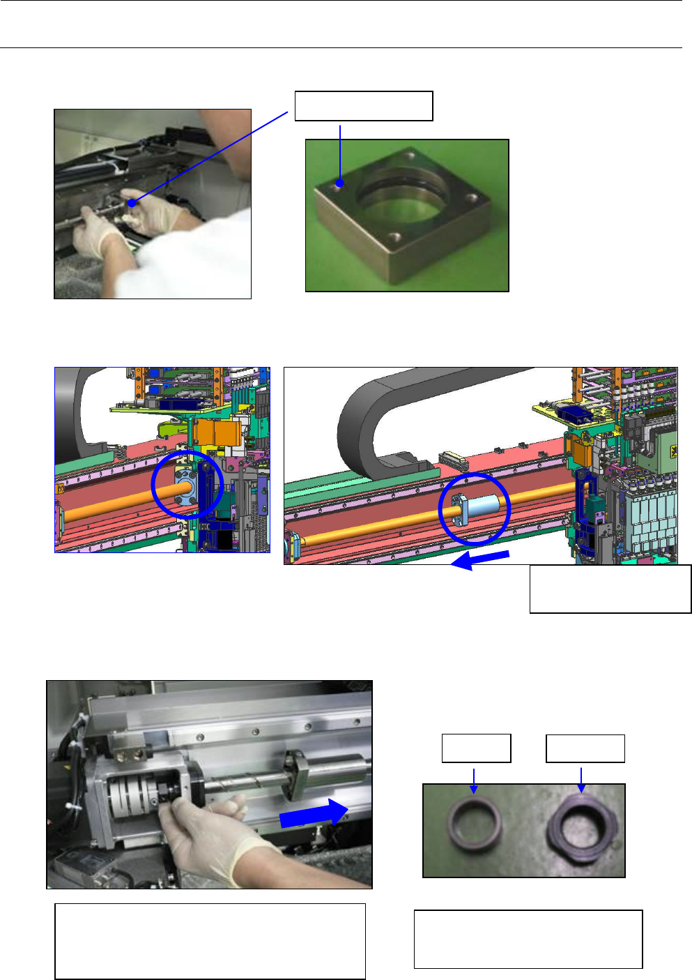 维修调整要领书 1- 34 ( 5 )将 X 滚珠螺杆支承件从 X 滚珠螺杆上卸下。 ( 6 )卸下 X 滚珠螺杆 _ 螺母部的固定螺丝。 ( 7 )卸下锁紧螺母、轴环。 锁紧螺母 轴环 一面把 X 滚珠螺杆朝右方向拉,一面转动锁紧 螺母卸下。 同样地也卸下轴环。 轴环(货号: 40177466 ) 锁紧螺母(货号: 40093876 ) 将 X _ 滚珠螺杆 向左侧 移动。 X 滚珠螺杆支承件