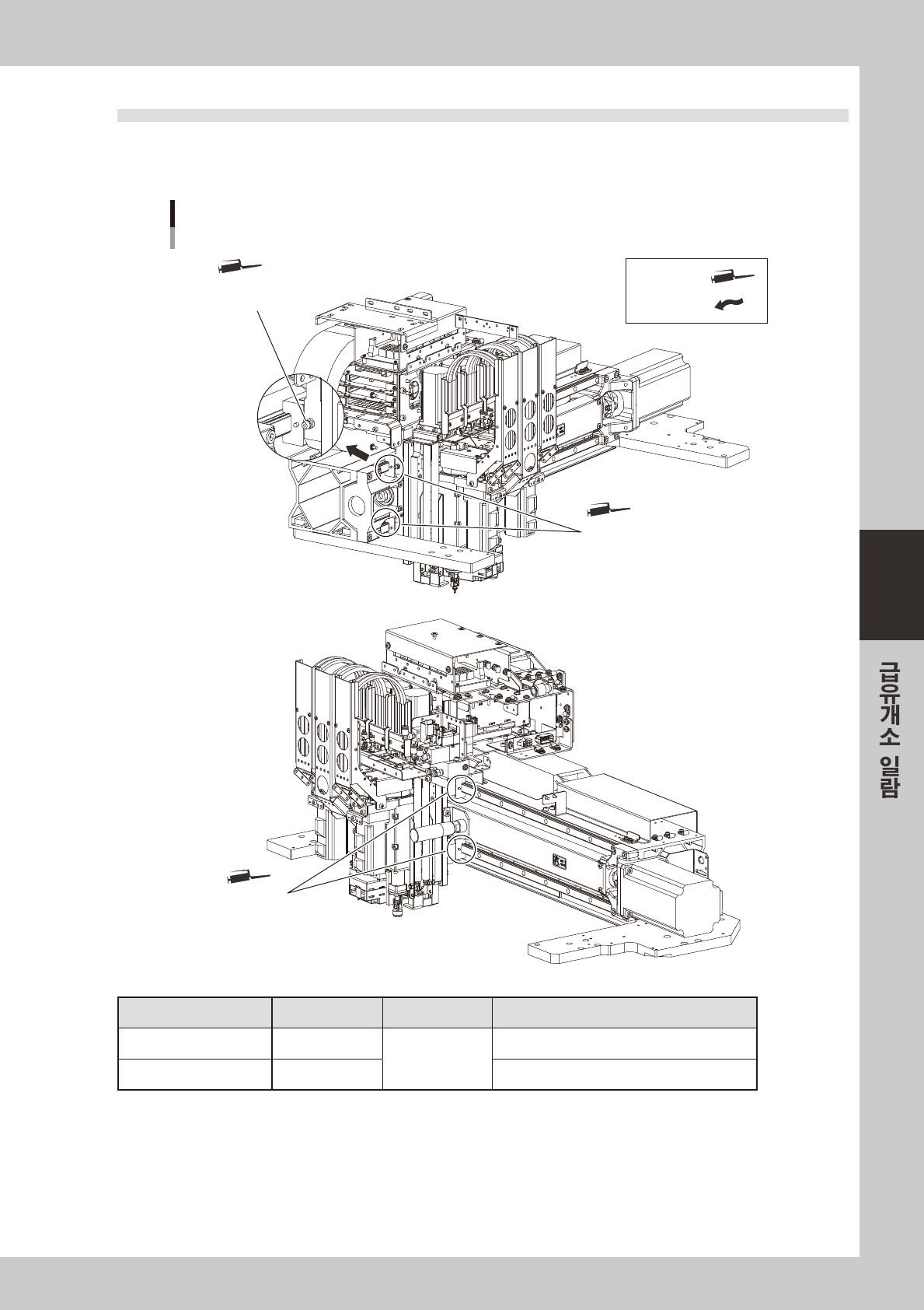 4-4 4 2.2.2 Y 축 가 이드와 볼 스 크 류 Y축의 급유개소 Y축 가이드부 구리스 니플 Y축 가이드부 구리스 니플 Y축 볼스크류부 구리스 니플 뒷면 구리스건 : 손으로 도포: 574 0 3 - N8 - 0 0 급유부위 급유개 소 주기 작 업방법 가 이드 2 1 회 / 매월 구리 스 건 : 표준노즐 볼 스 크류 1