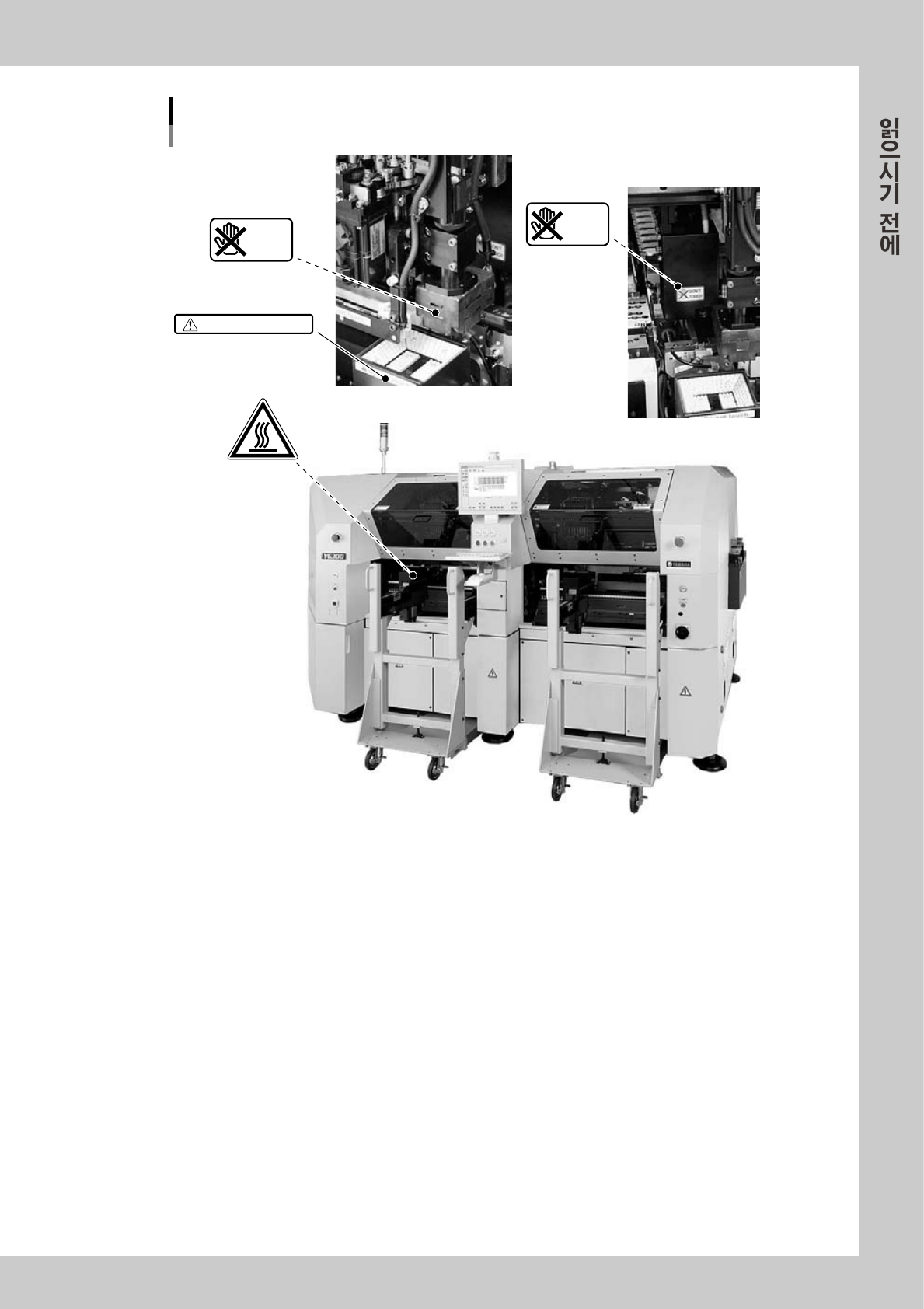 xi 경고표시라벨 부착장소2 ■ 장비내부 모터부 DON'T TOUCH ■ 피듀셜 카메라 커버내부 DON'T TOUCH ■ 사이드 View 카메라 ■ 멀티 카메라 DO NOT TOUCH 57 0 01- F 1- 0 0