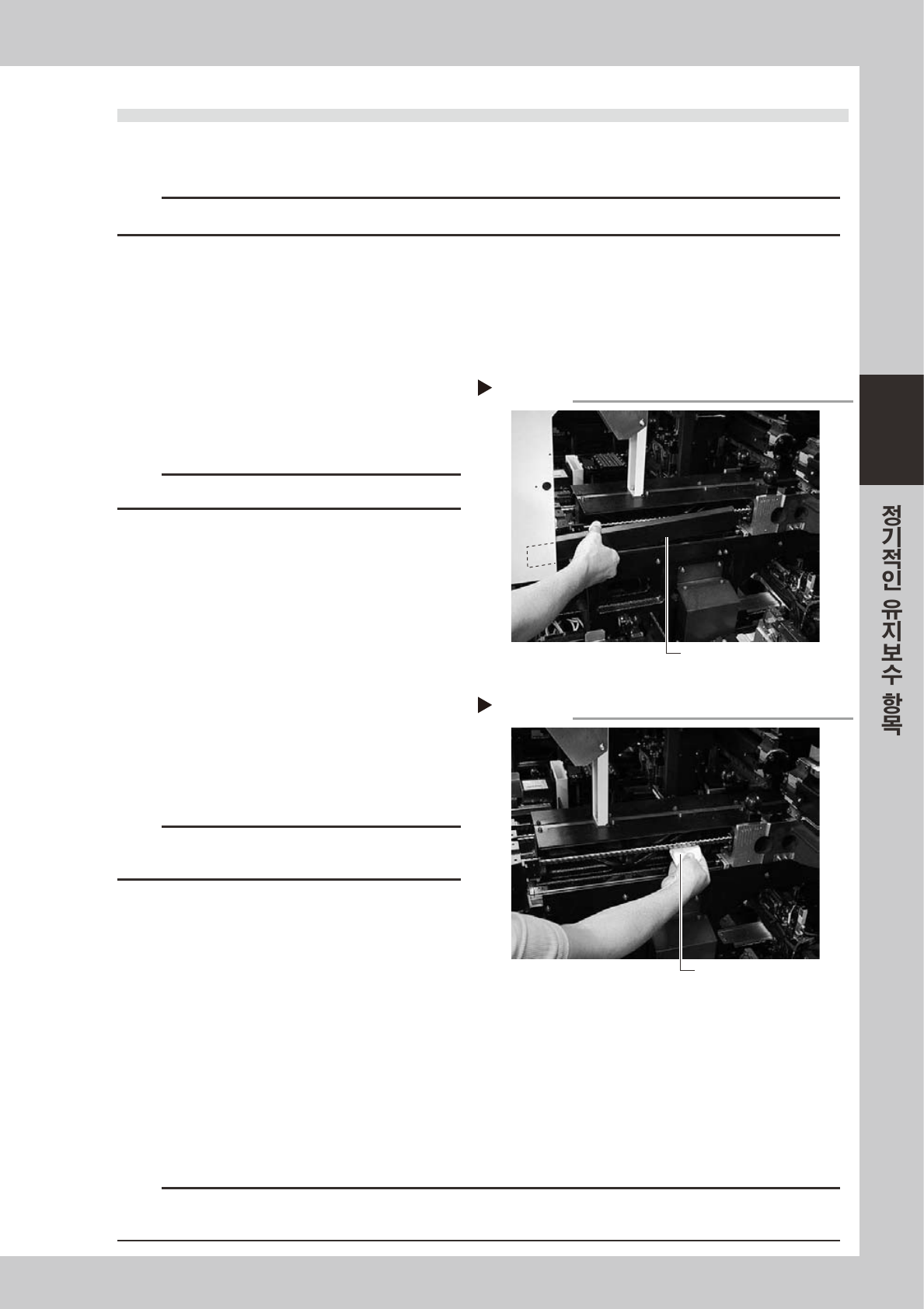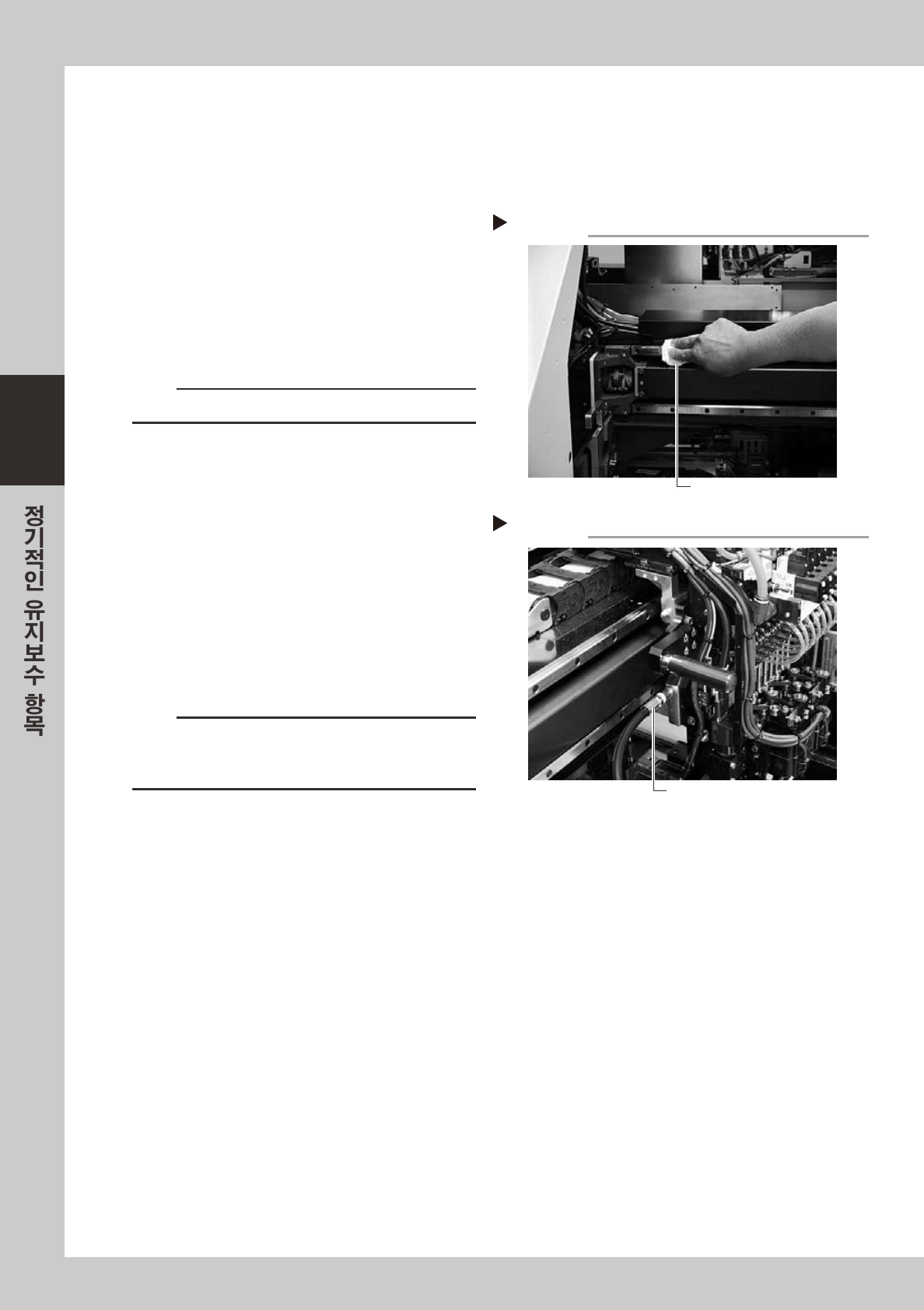 3-8 3 2 . 3 . 2 X 축 리 니 어 가 이 드 청 소 • 급 유 e 1 비 상 정 지 버 튼 을 누 릅 니 다 . 작 업을 안 전하게 하 기 위해 서 반 드 시 장 비를 비 상 정지 상 태로 해 주 십시오 . 2 X 축 리 니 어 가 이 드 를 닦 습 니 다 . 1. 헤드 를 한 쪽 끝으 로 이 동시키 고 , 리니어 가 이 드 …
